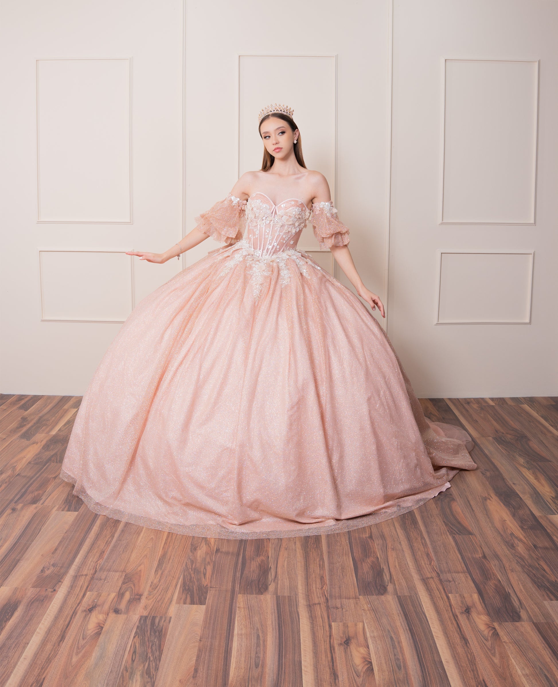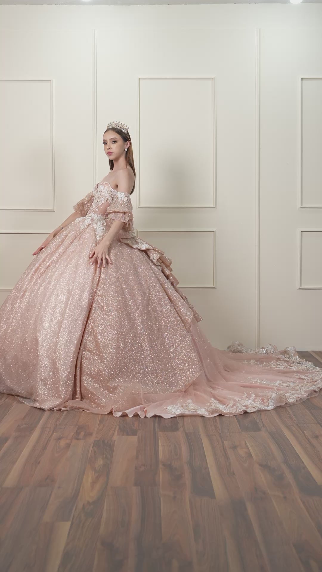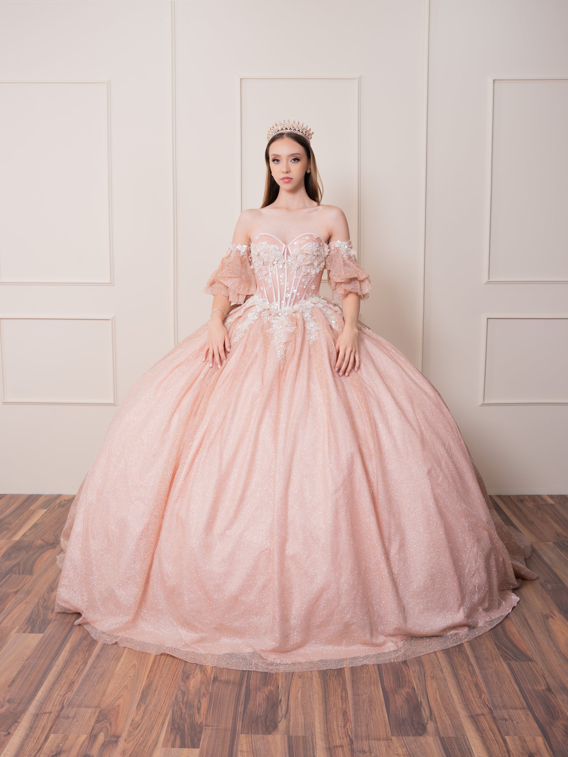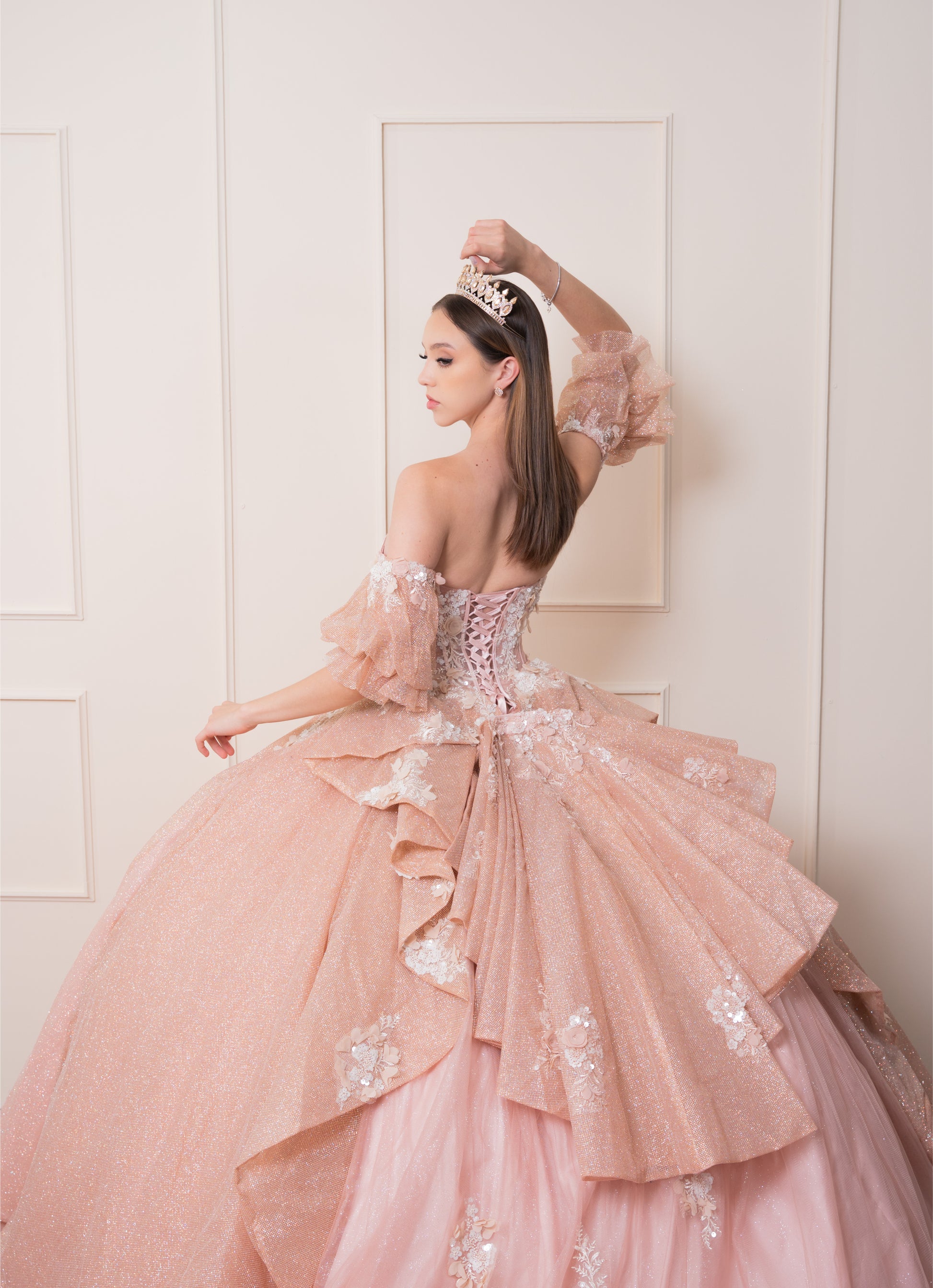 Vestido de XV Años Rose Gold Glitter Mangas Amponas con Encaje y Pedrería