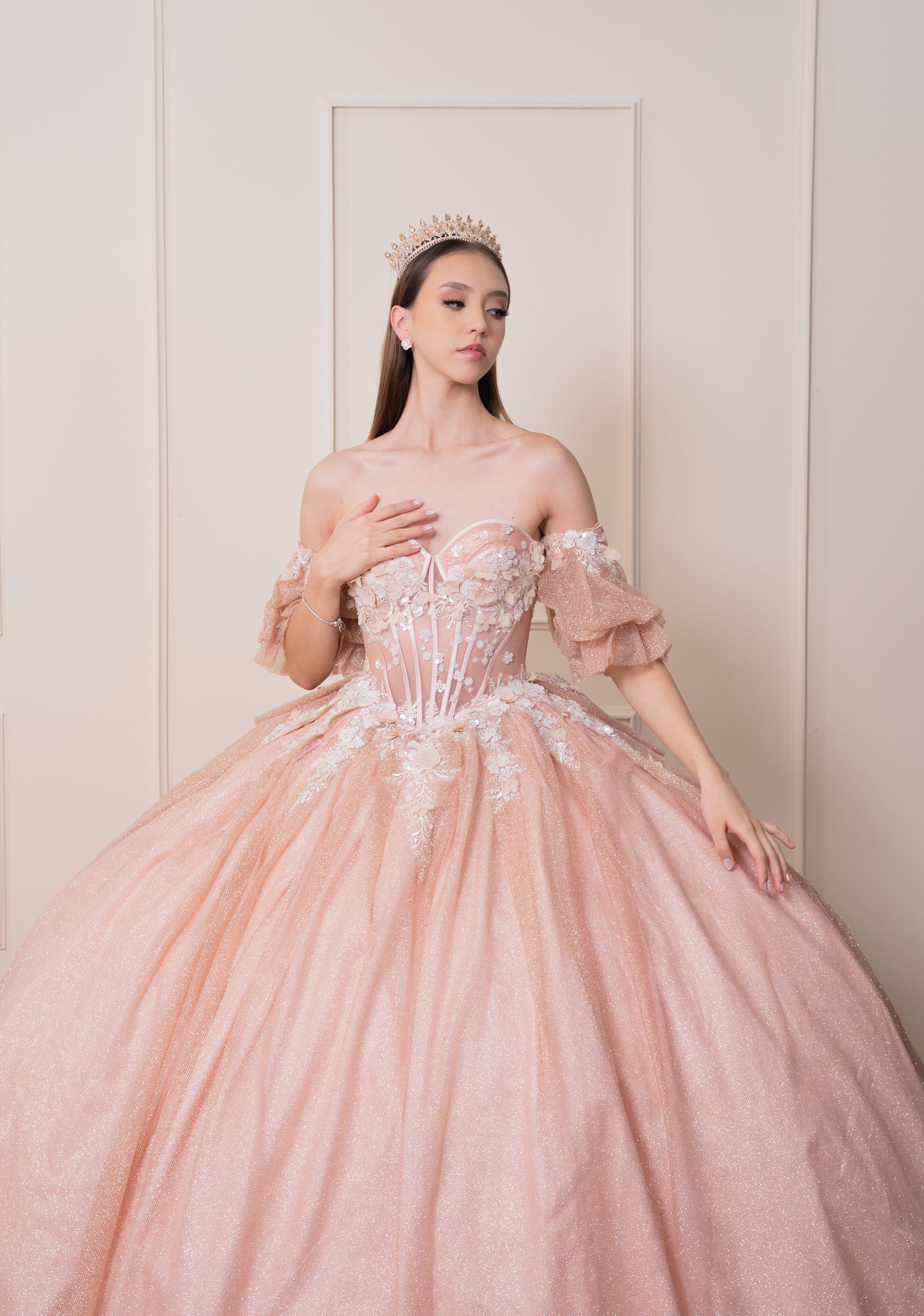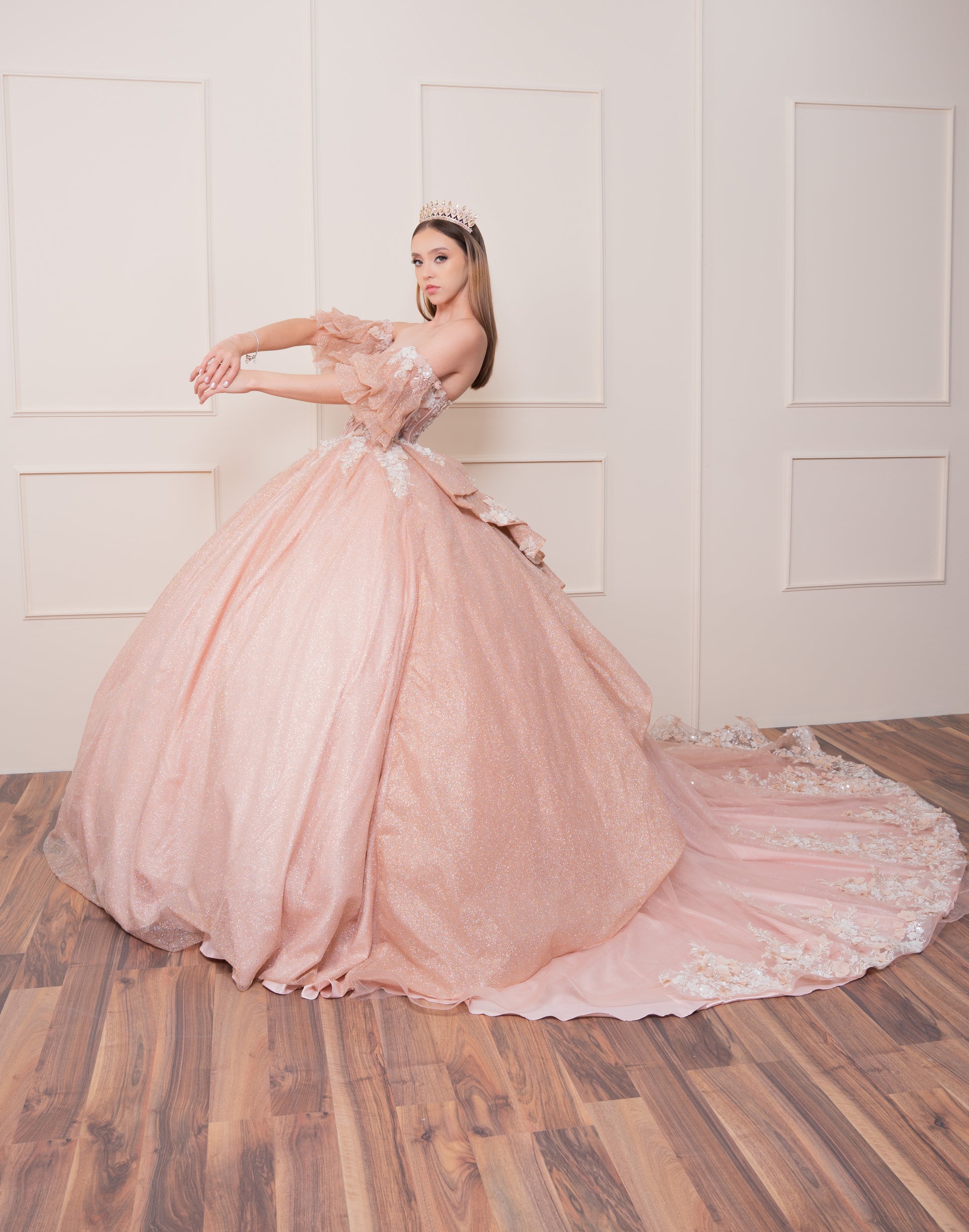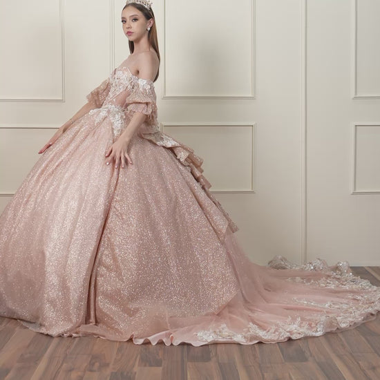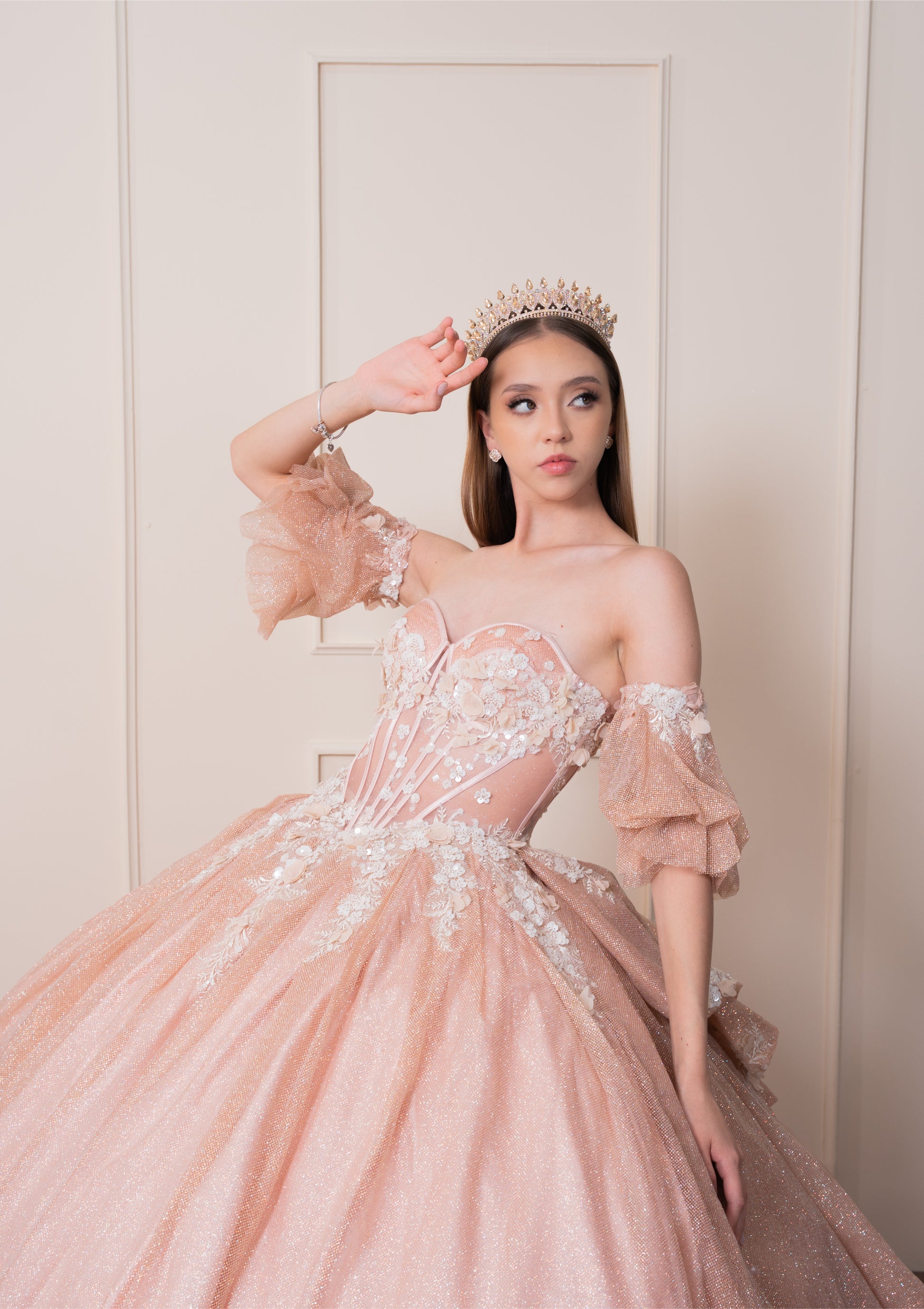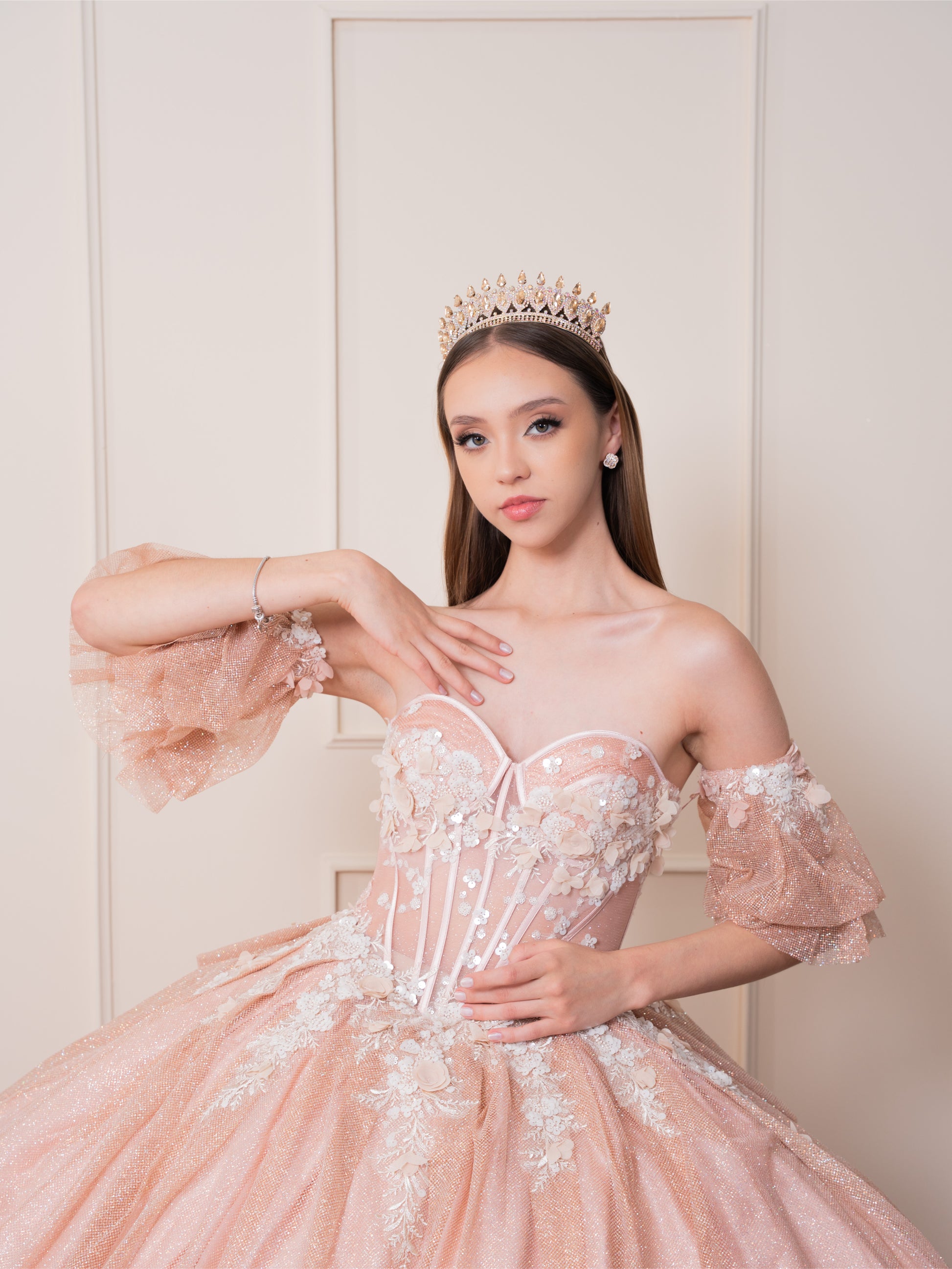 Vestido de XV Años Rose Gold Glitter Mangas Amponas con Encaje y Pedrería