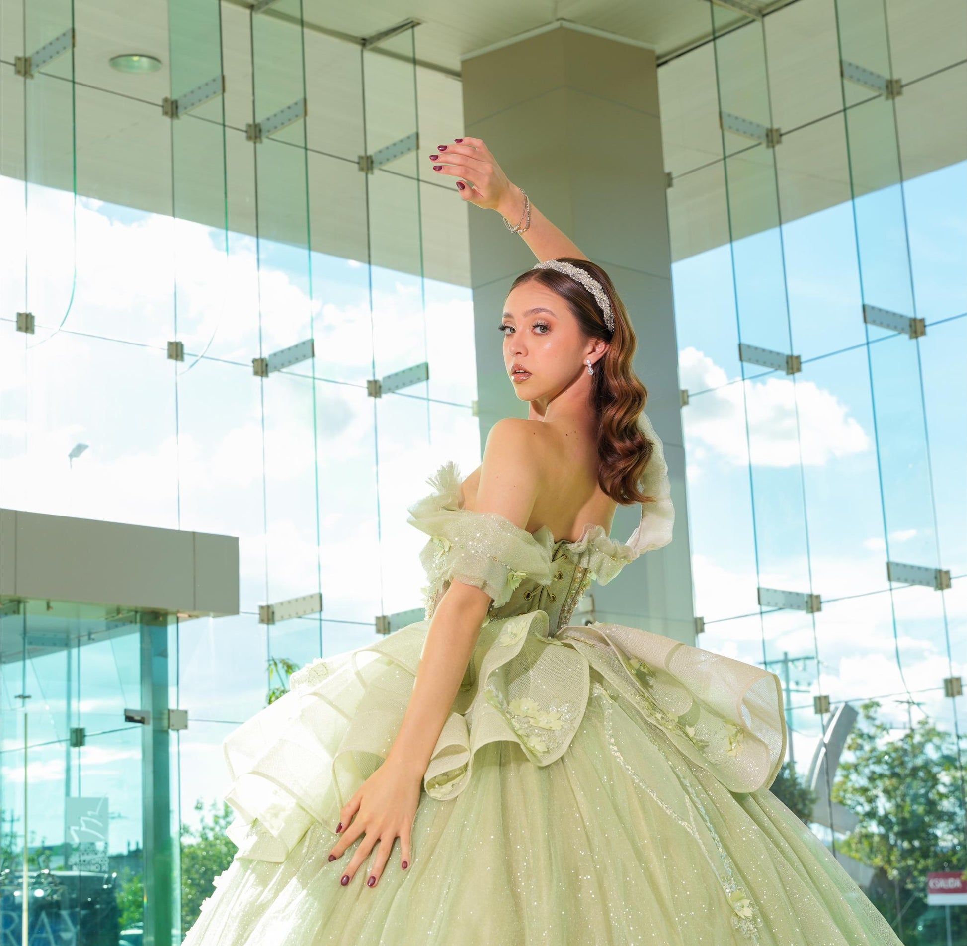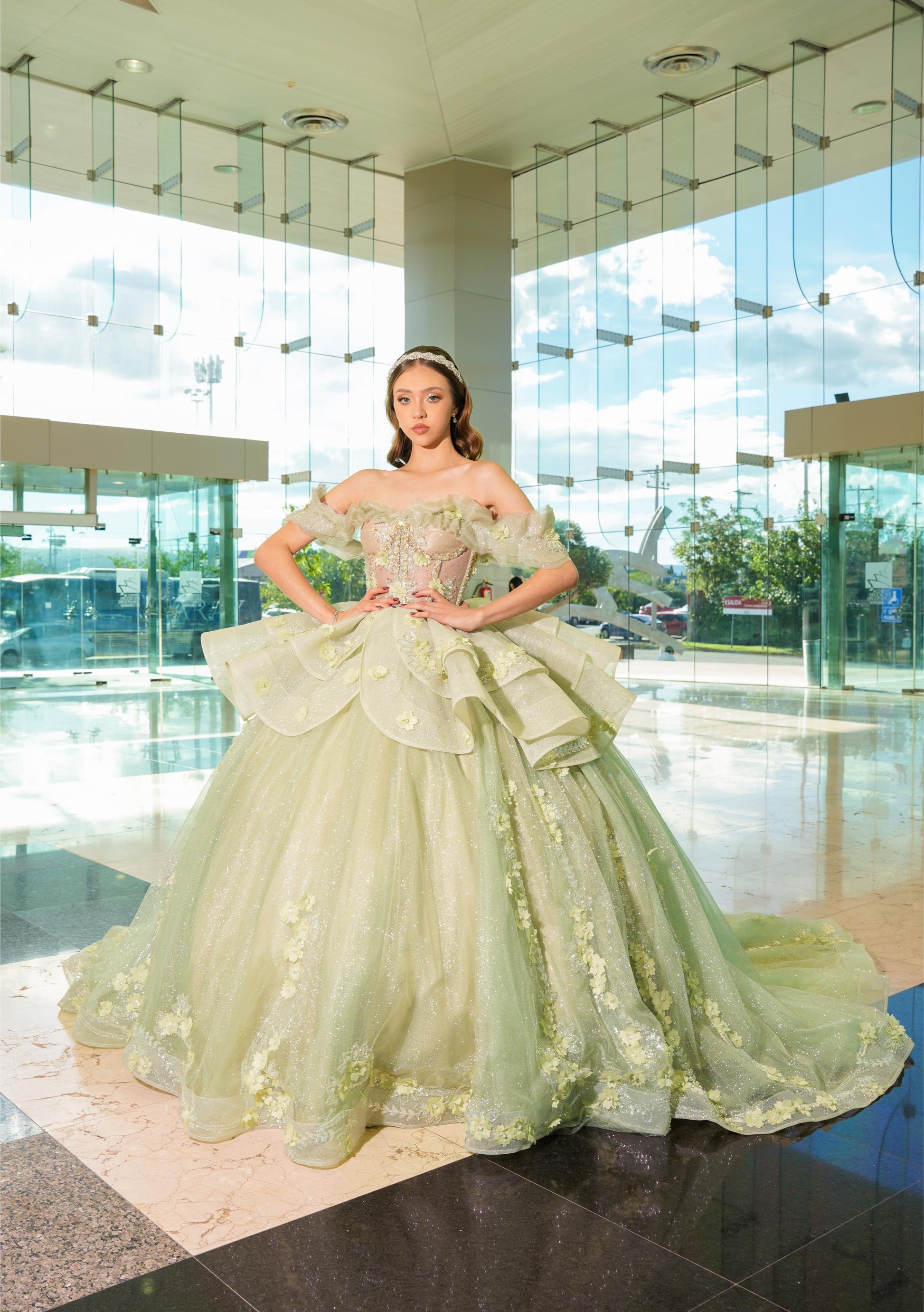 Vestido de XV Años Verde Sage Brilloso Olanes en Falda con Flores