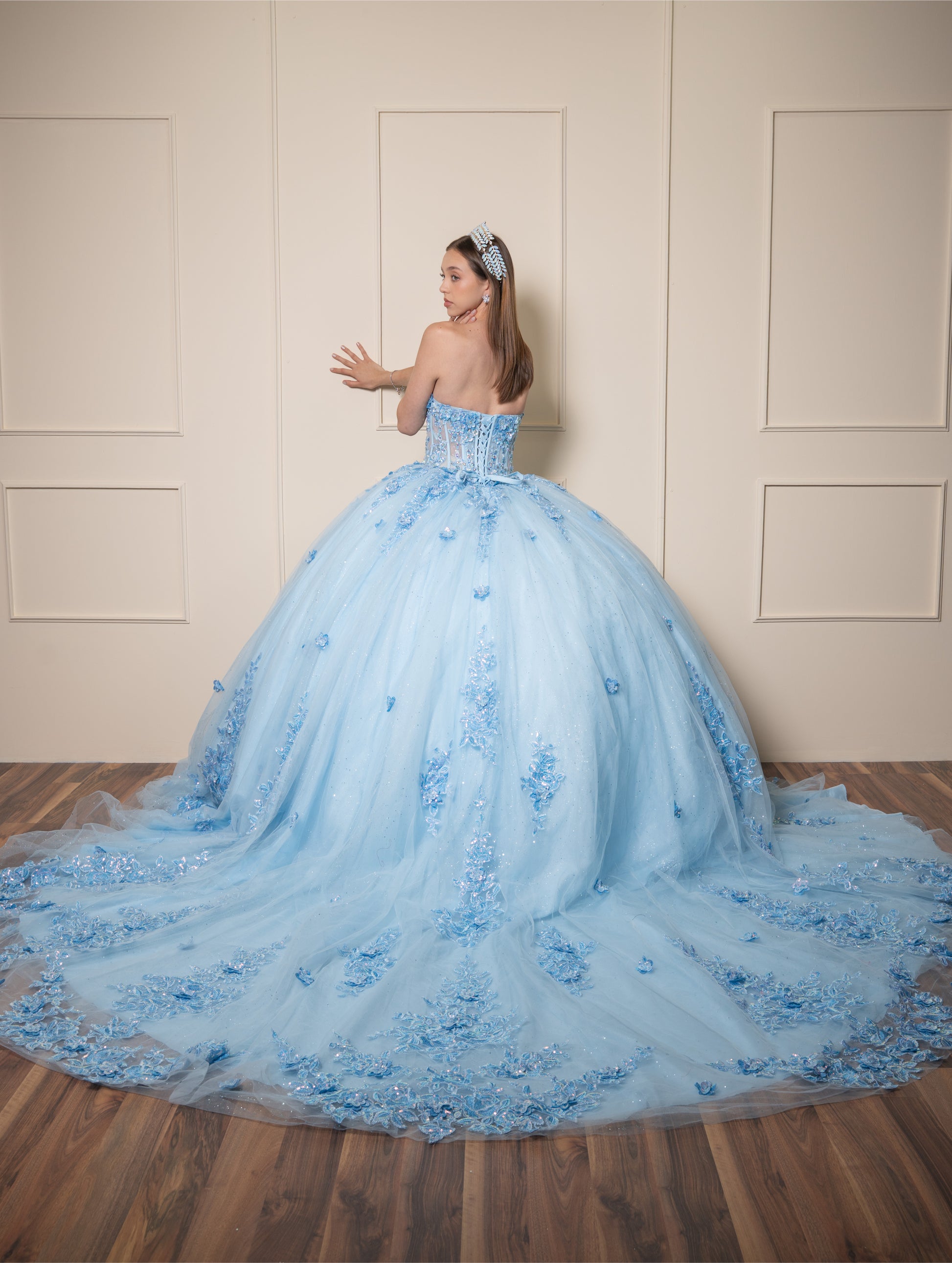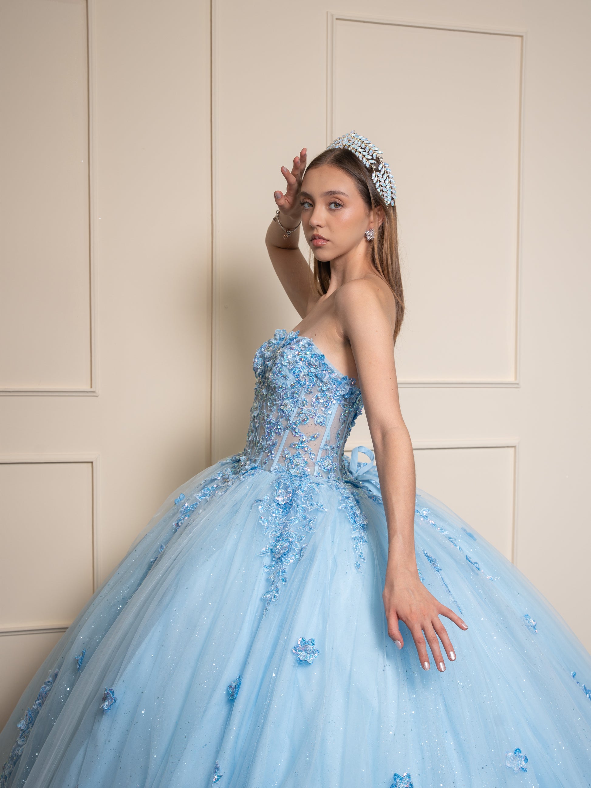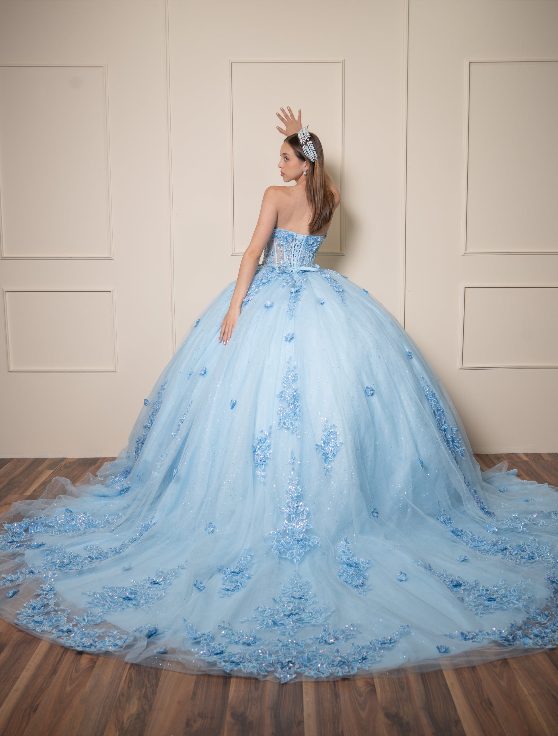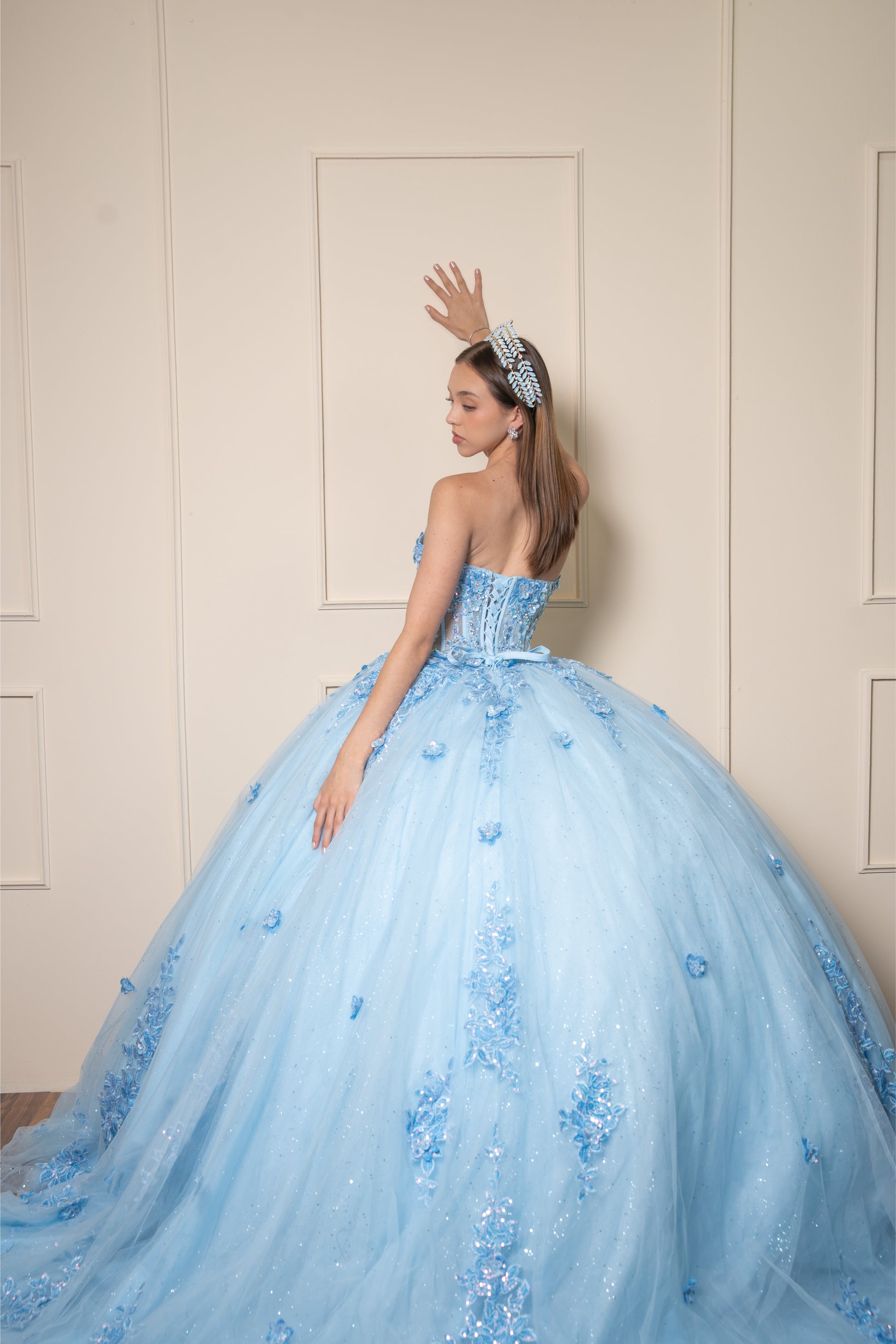 Vestido de XV Años Vestido Azul Cielo Lentejuela Tornasol Estraple