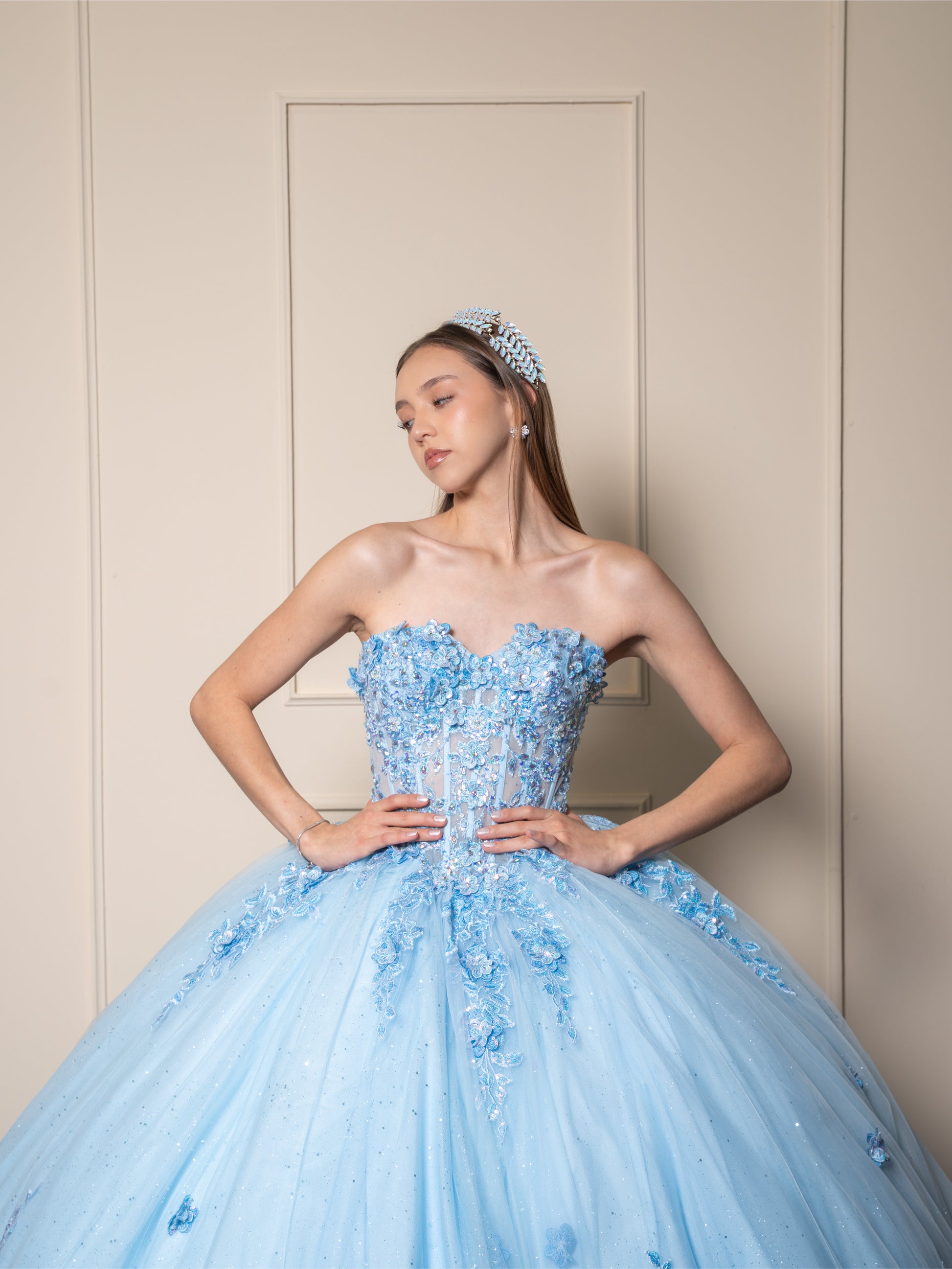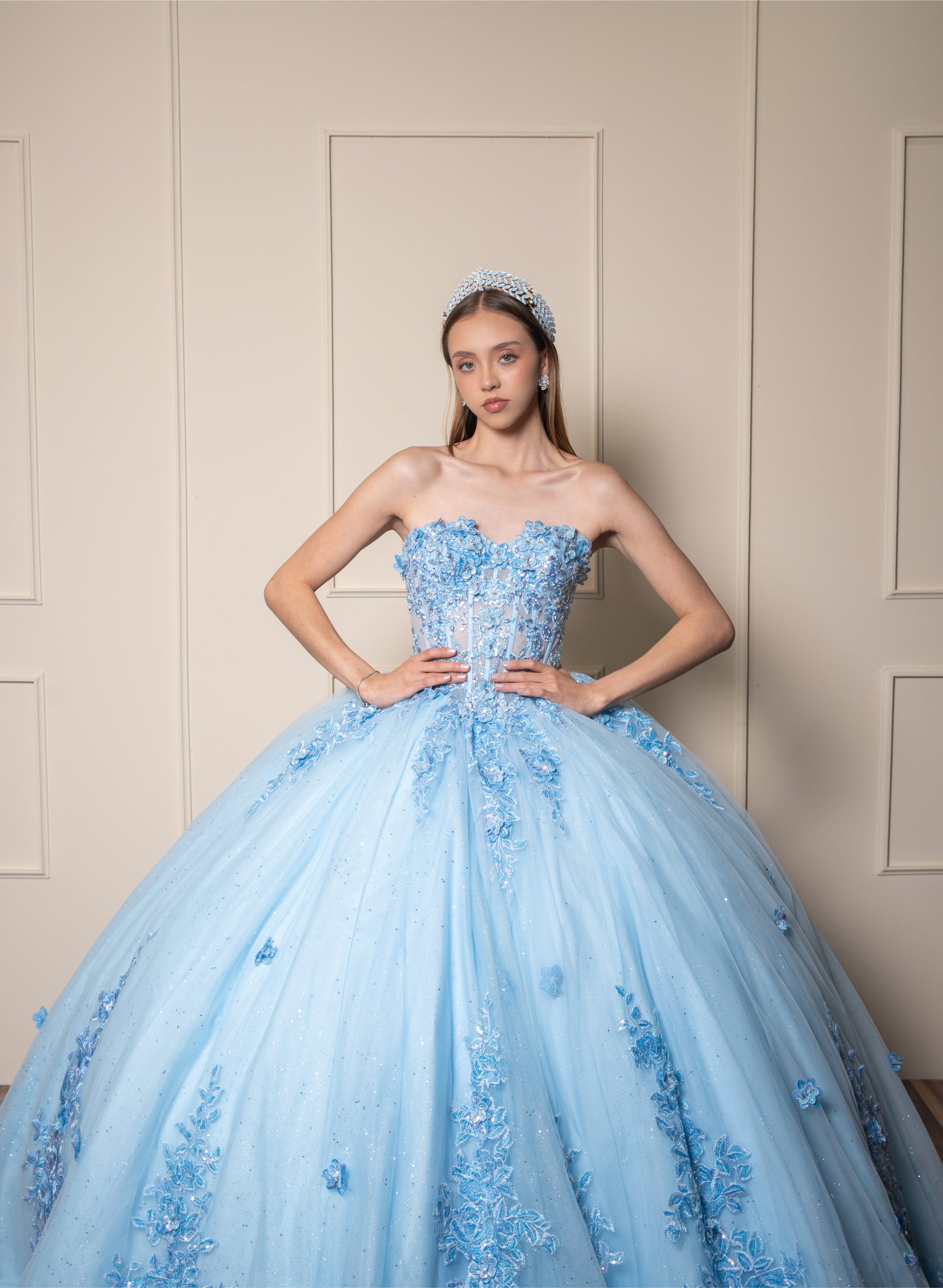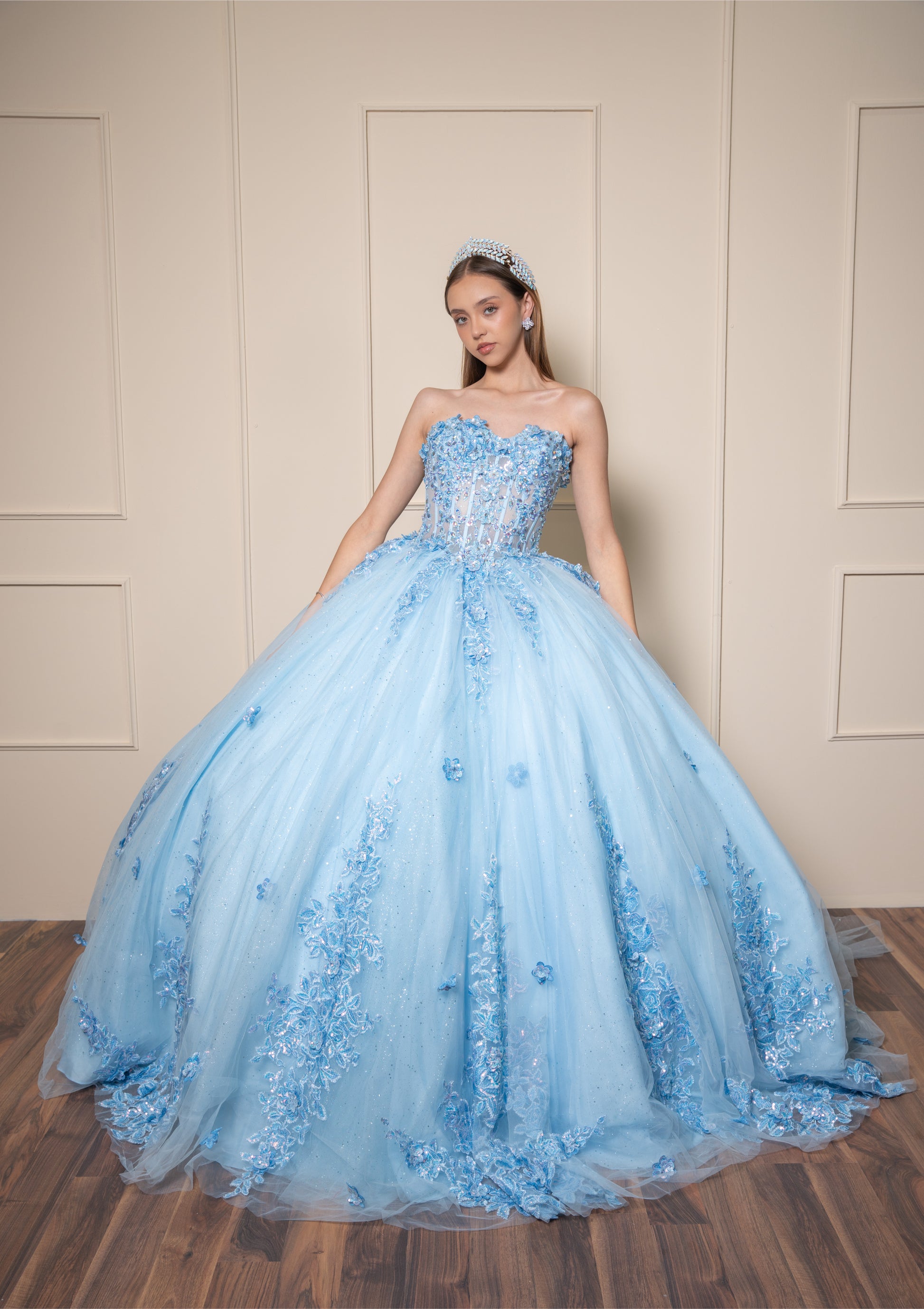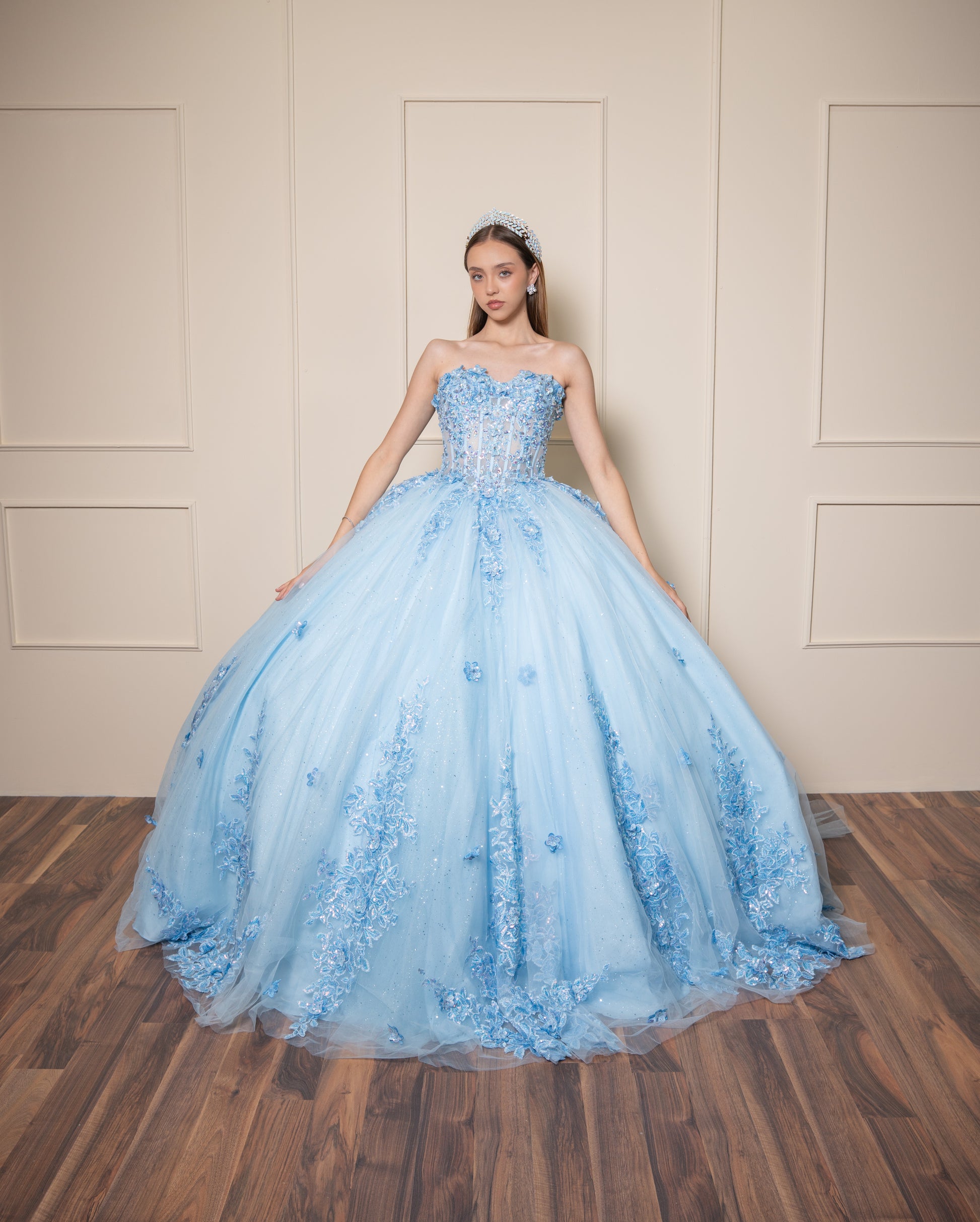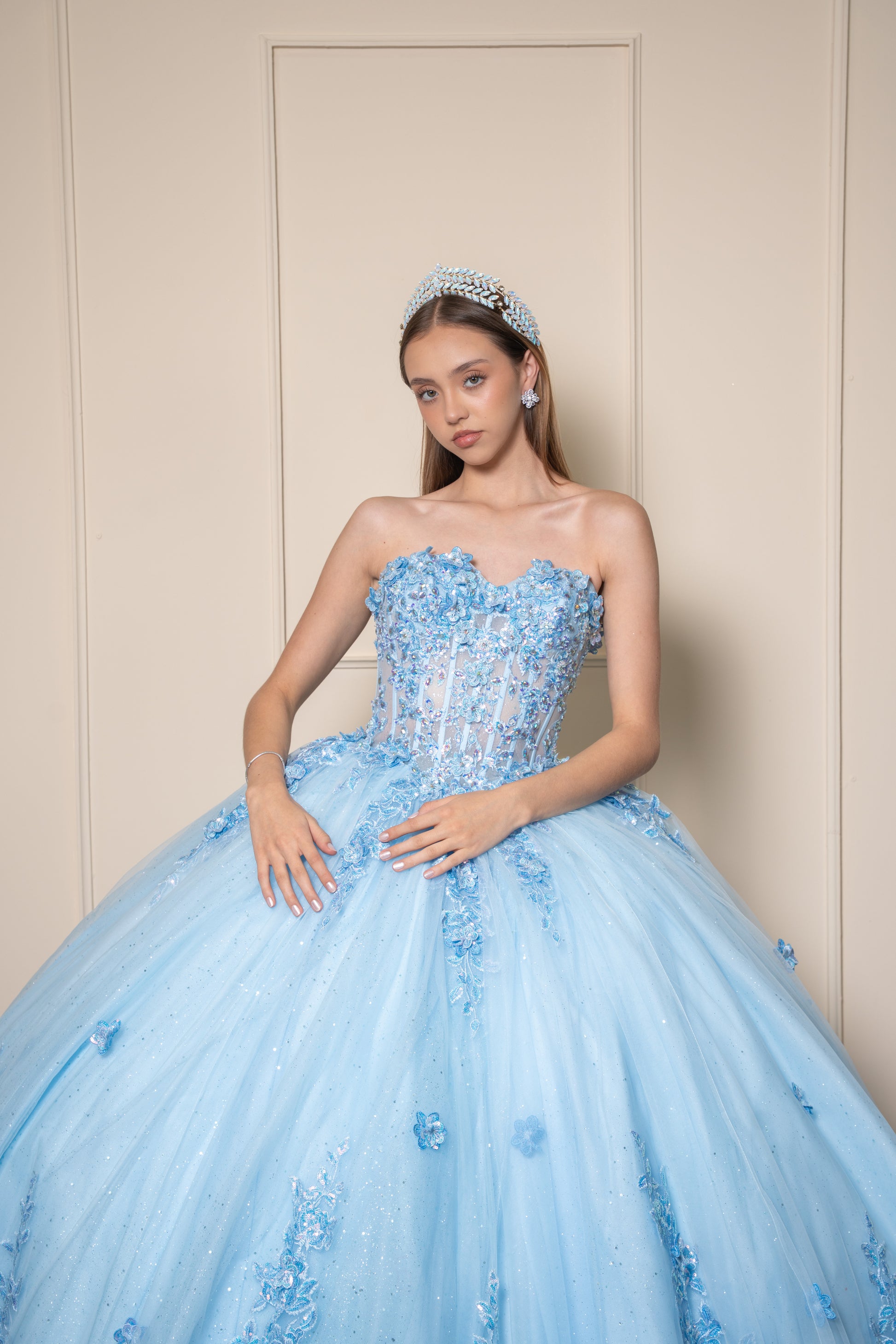 Vestido de XV Años Vestido Azul Cielo Lentejuela Tornasol Estraple