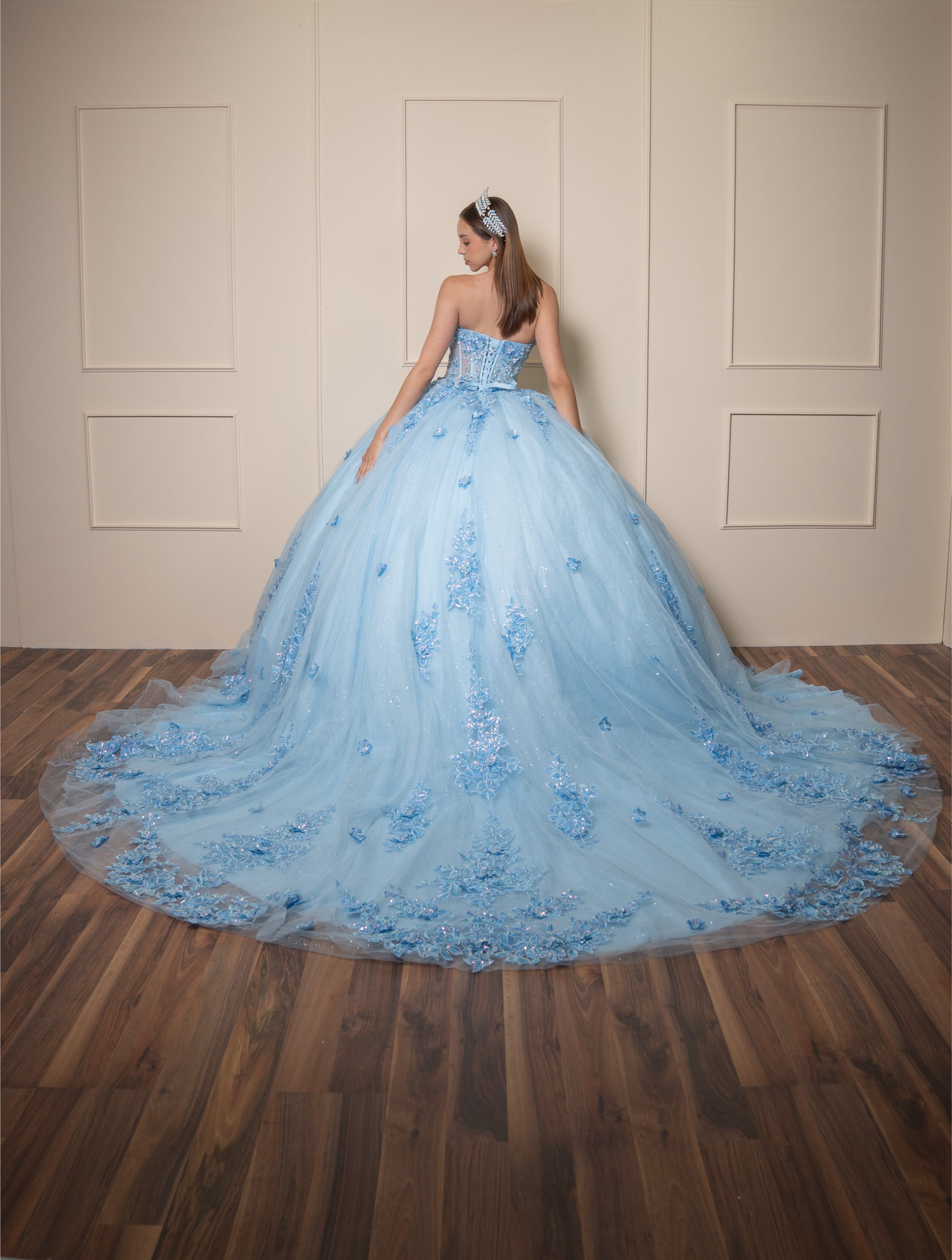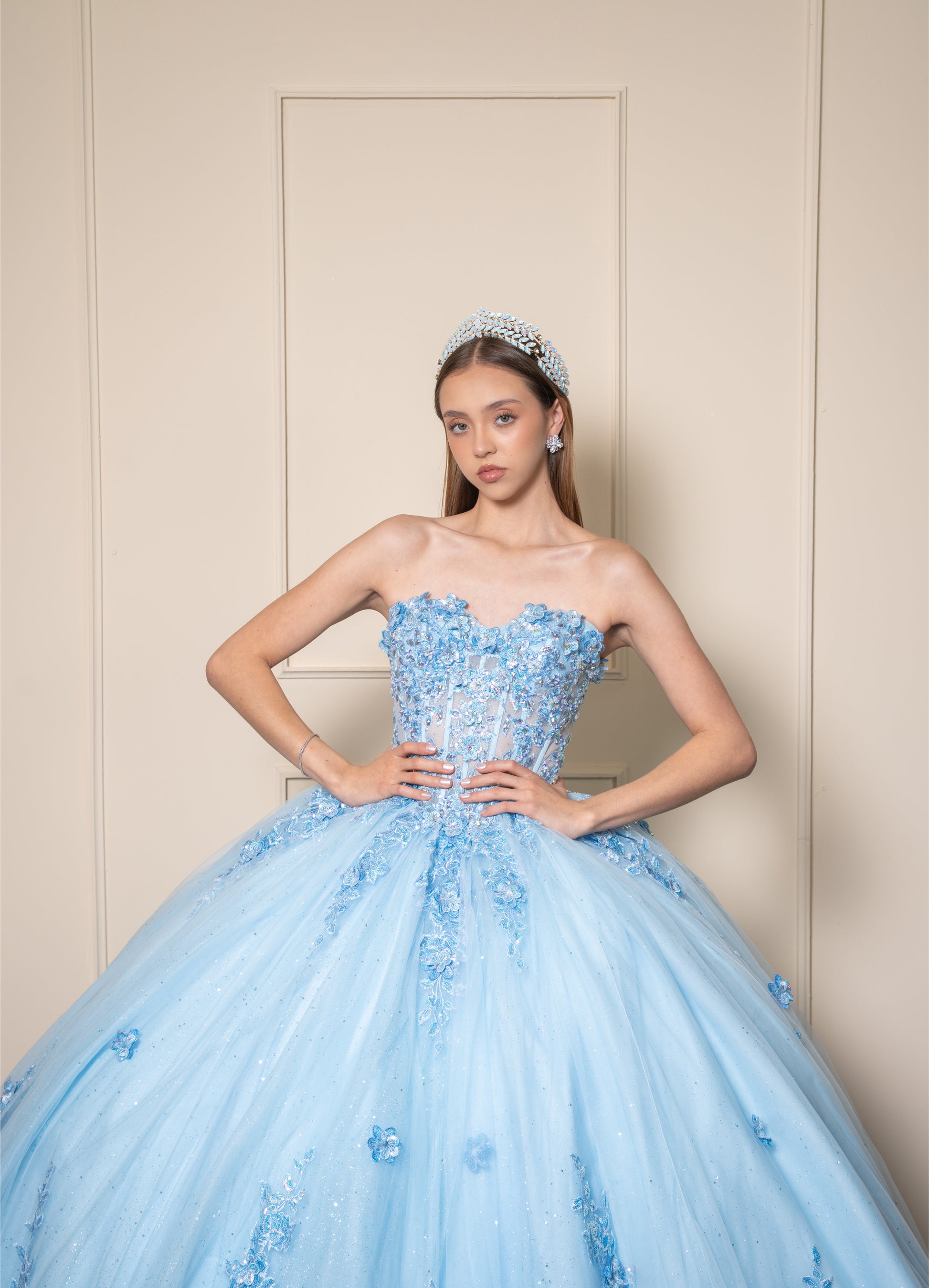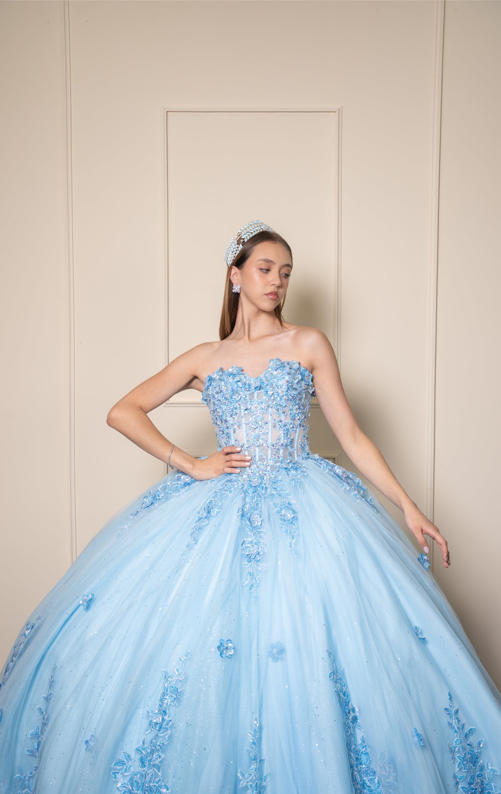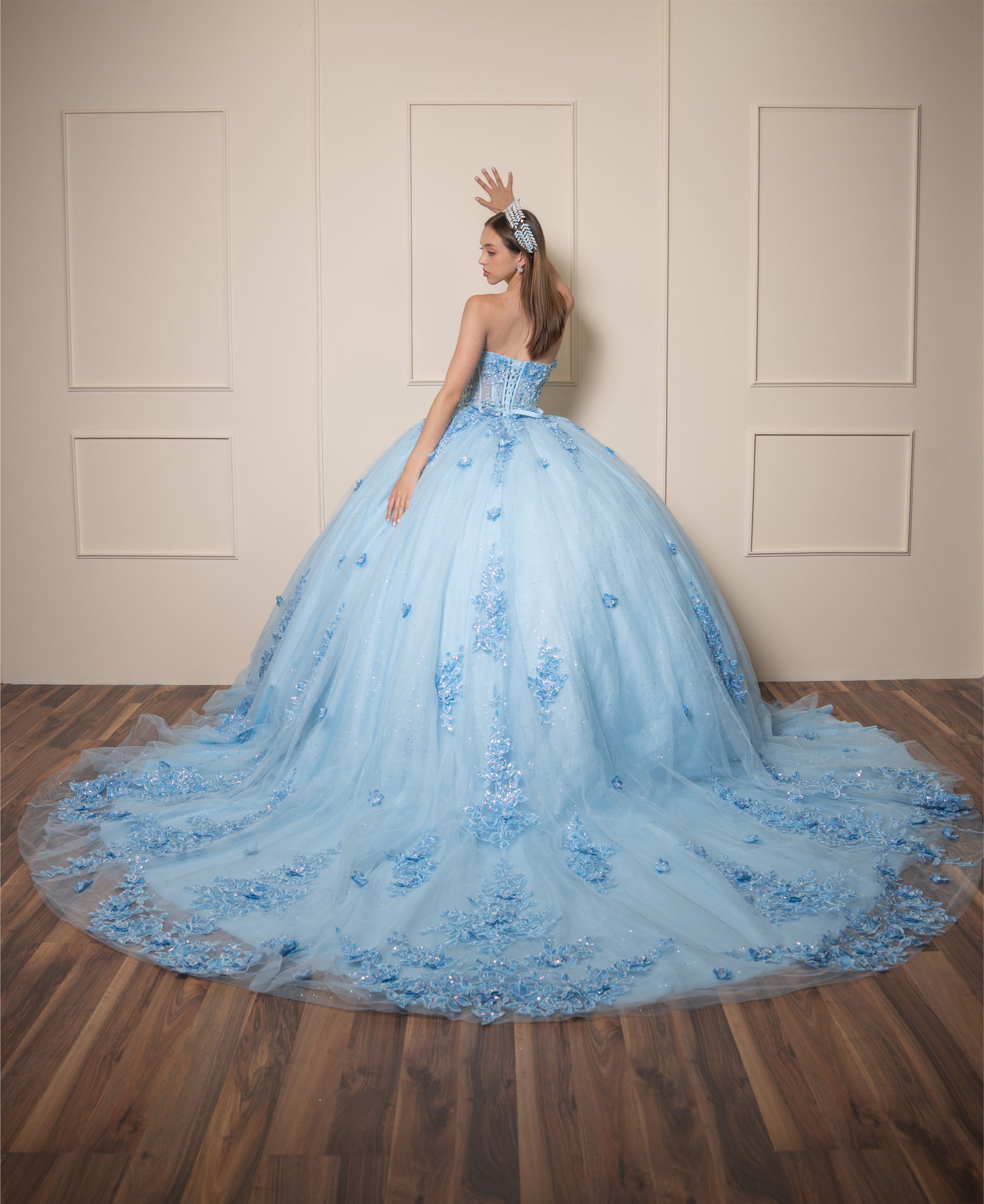 Vestido de XV Años Vestido Azul Cielo Lentejuela Tornasol Estraple