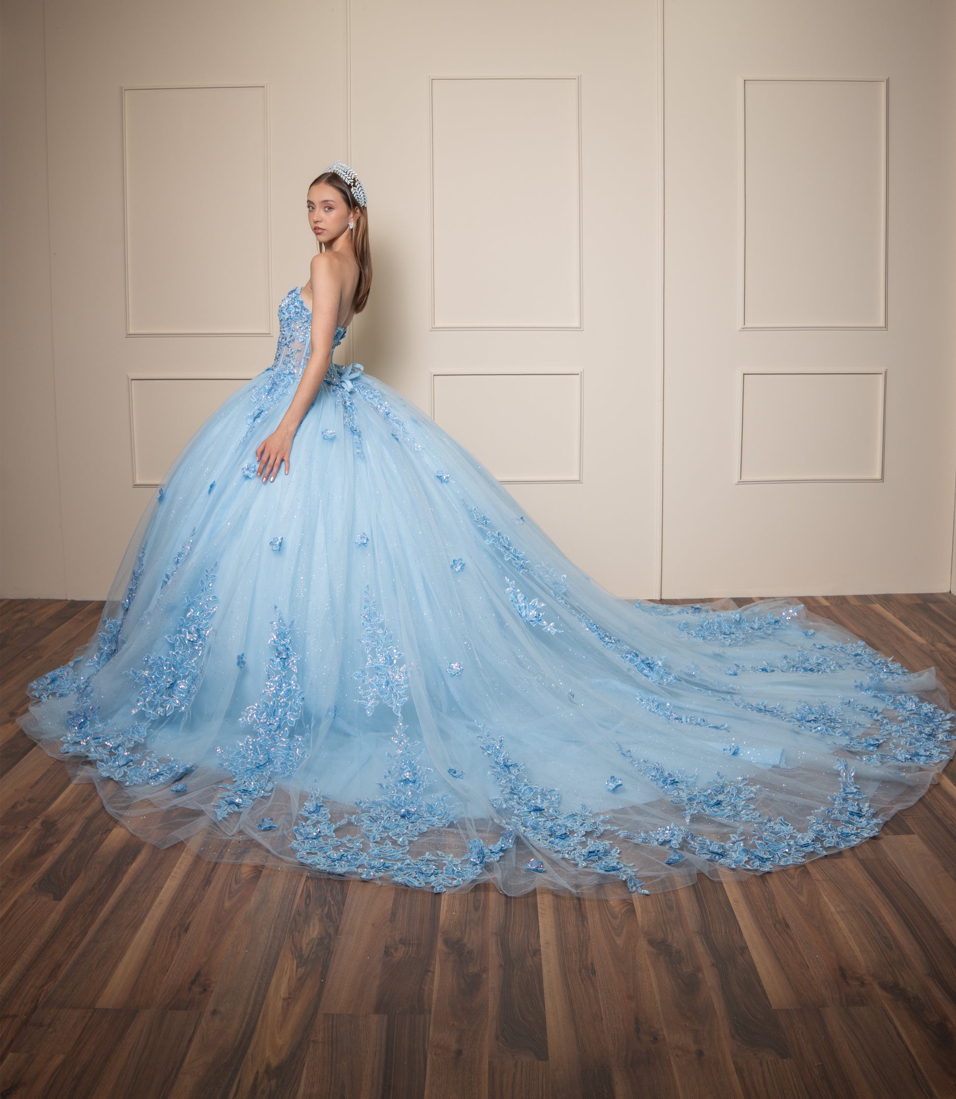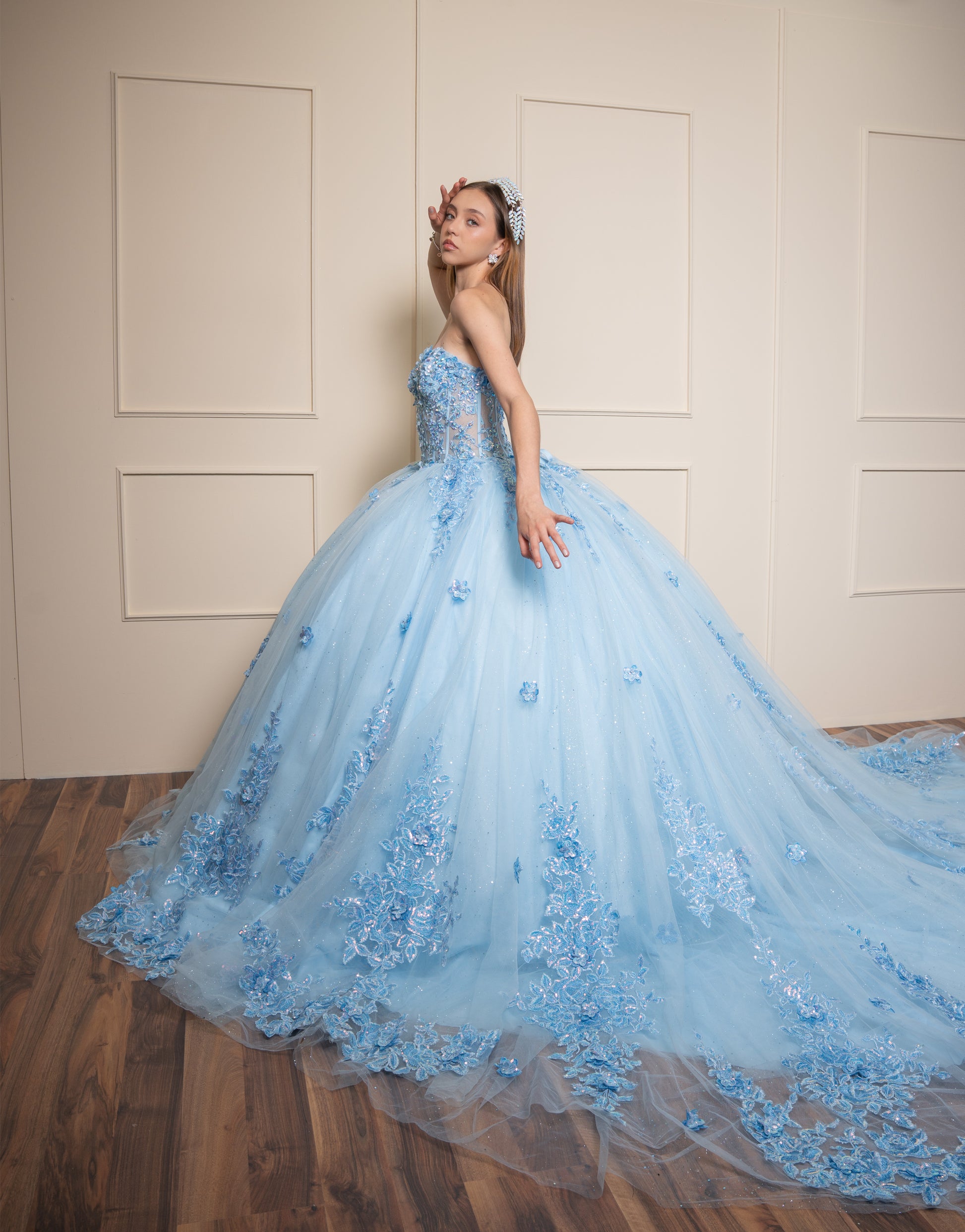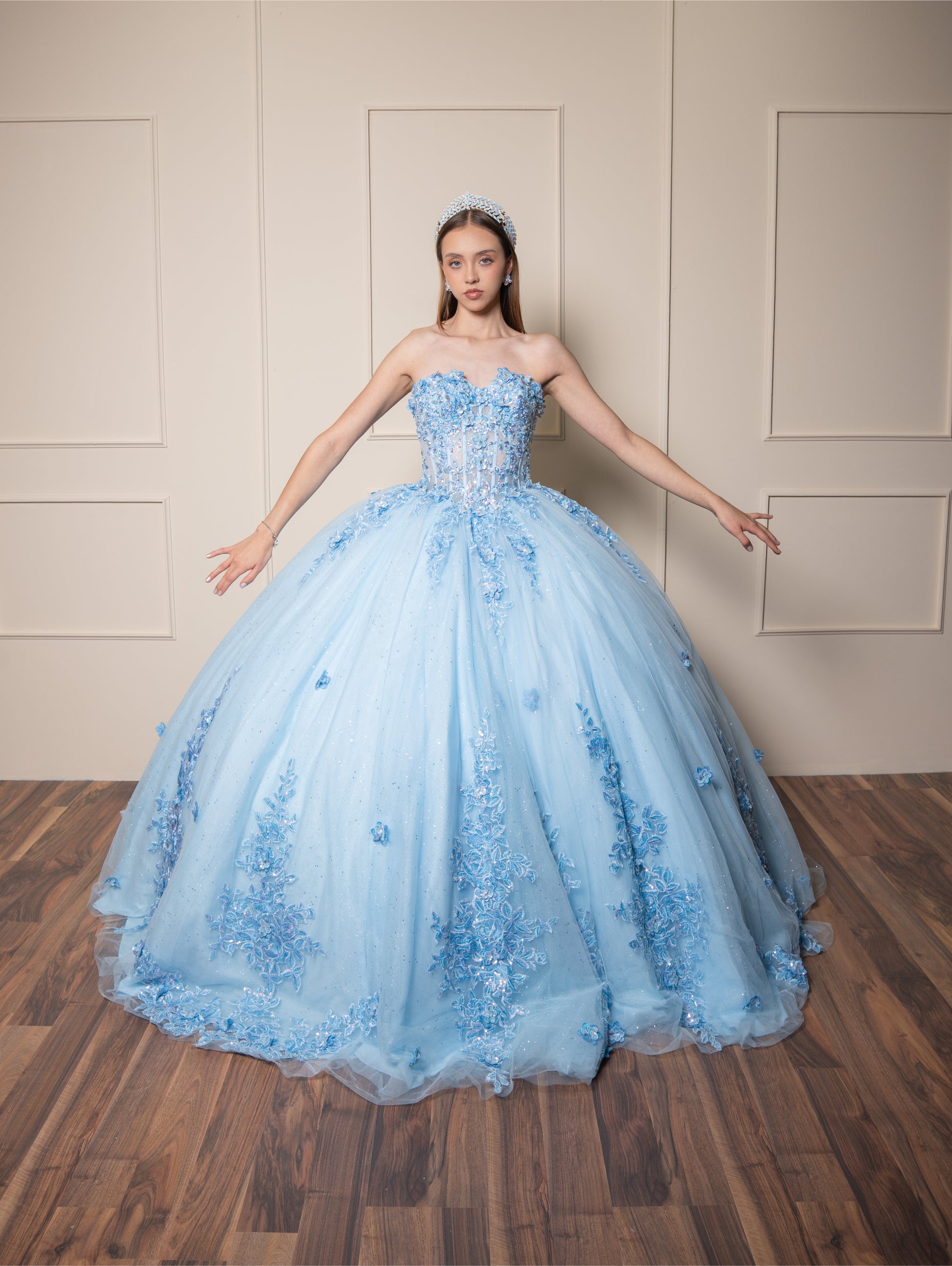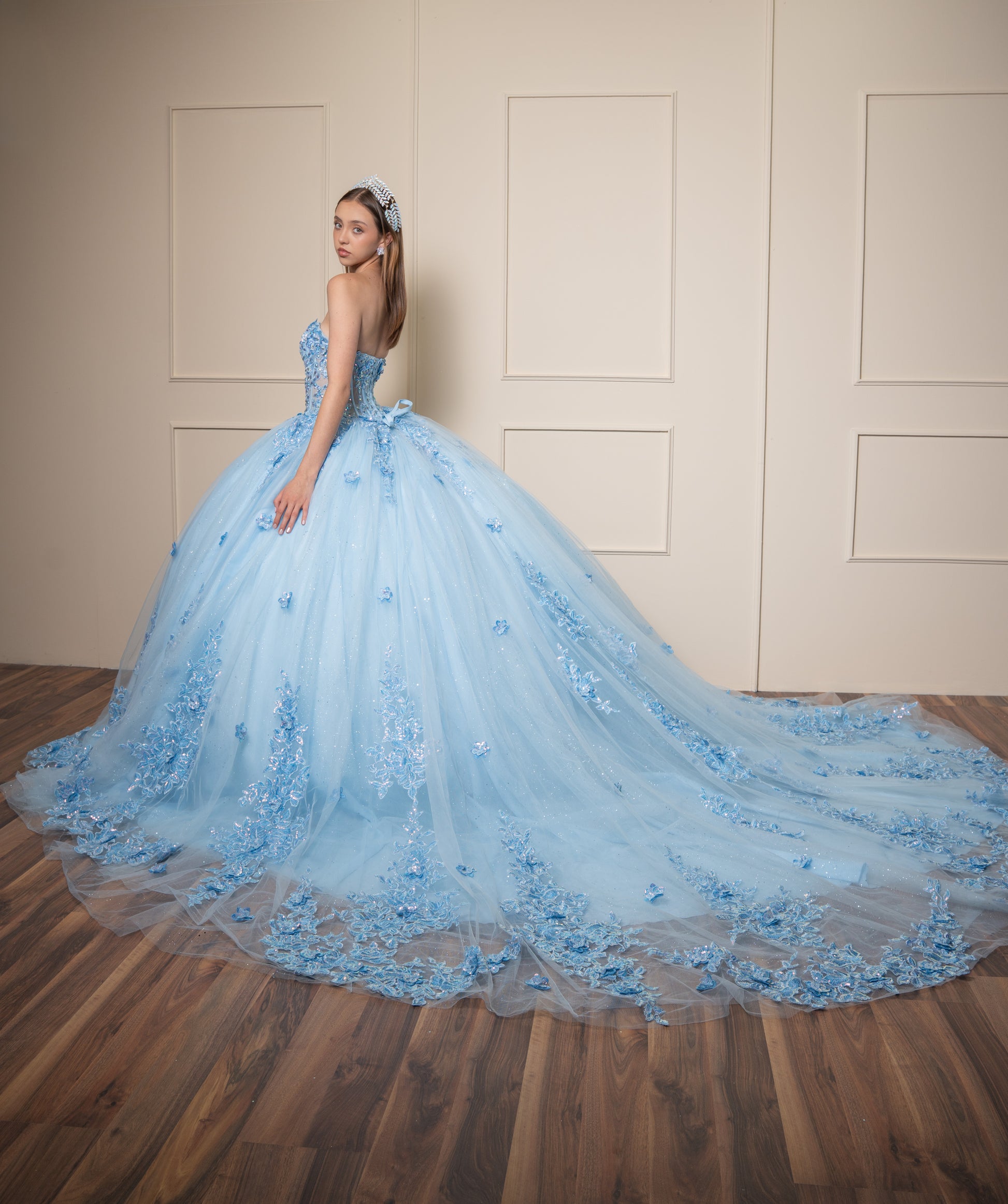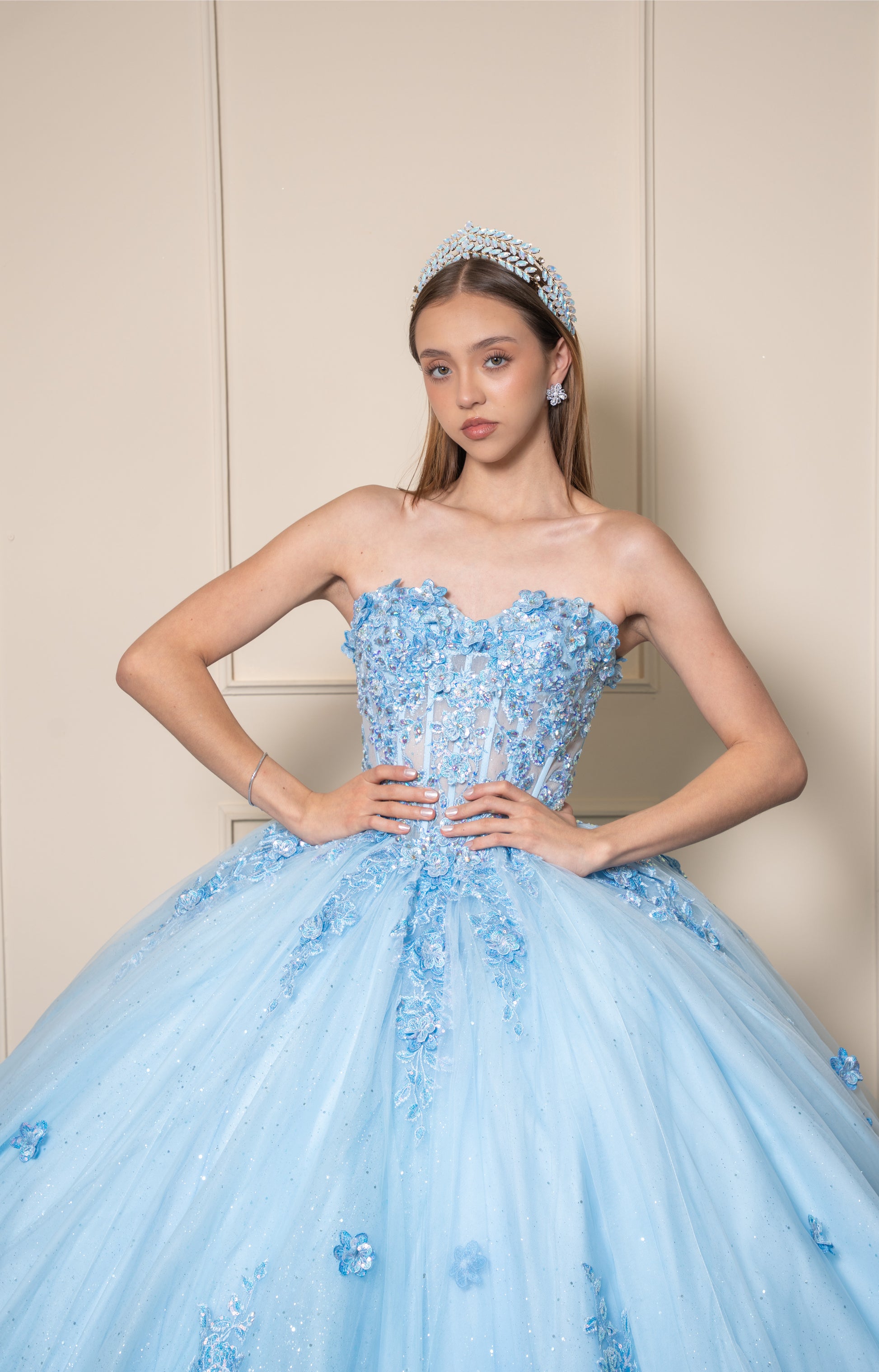 Vestido de XV Años Vestido Azul Cielo Lentejuela Tornasol Estraple