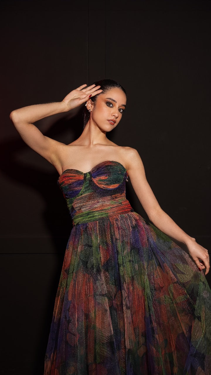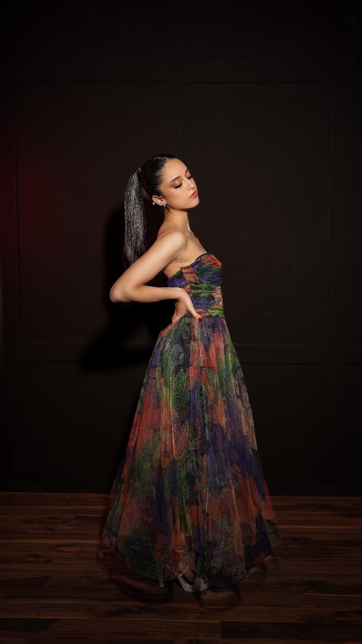 Vestido Multicolor Straple Corte Princesa Midi