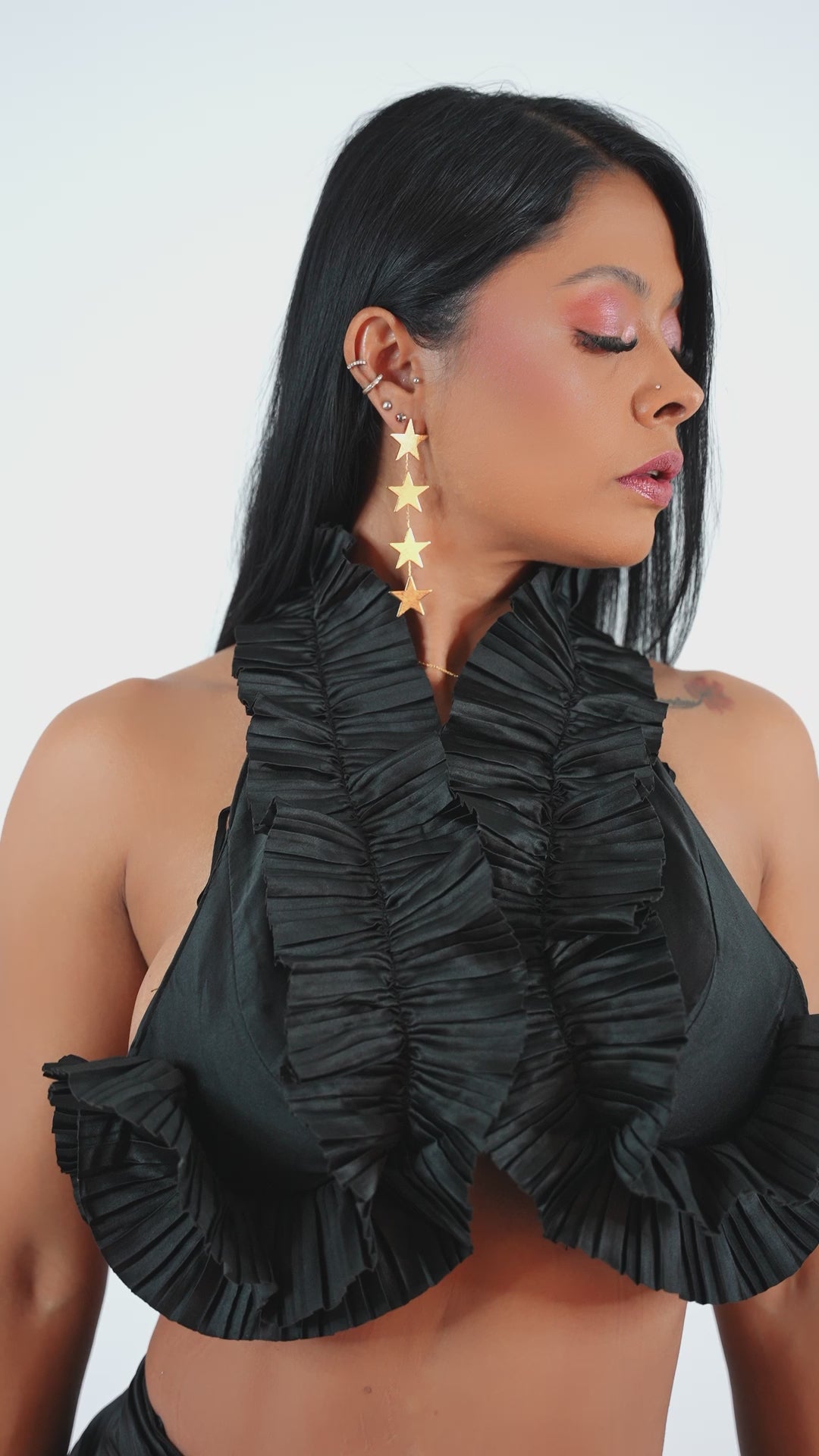 Vestido Negro Dos Piezas Midi Con Olanes En Escote Y Corrugado De Abajo