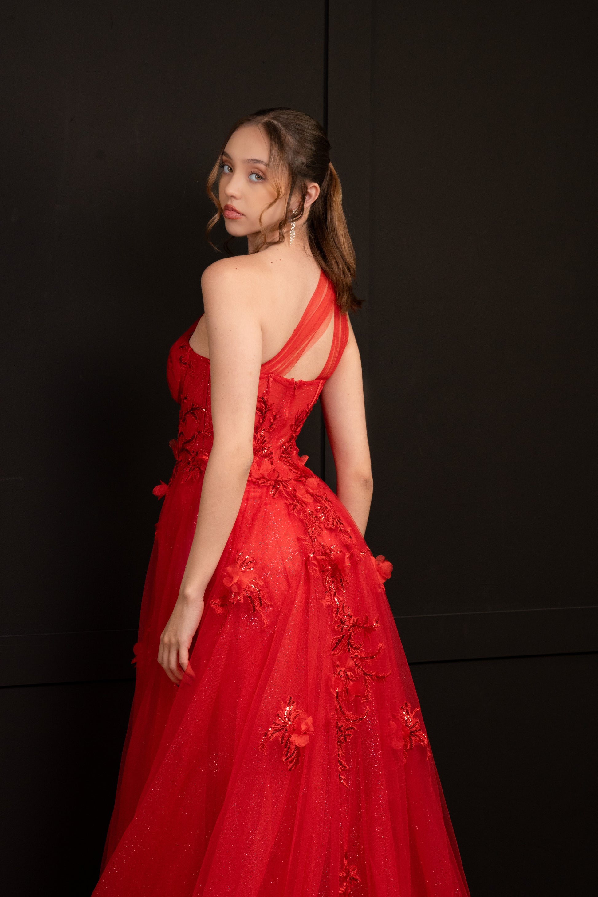 Vestido Rojo Un Tirante Corset De Ziper Con Flores