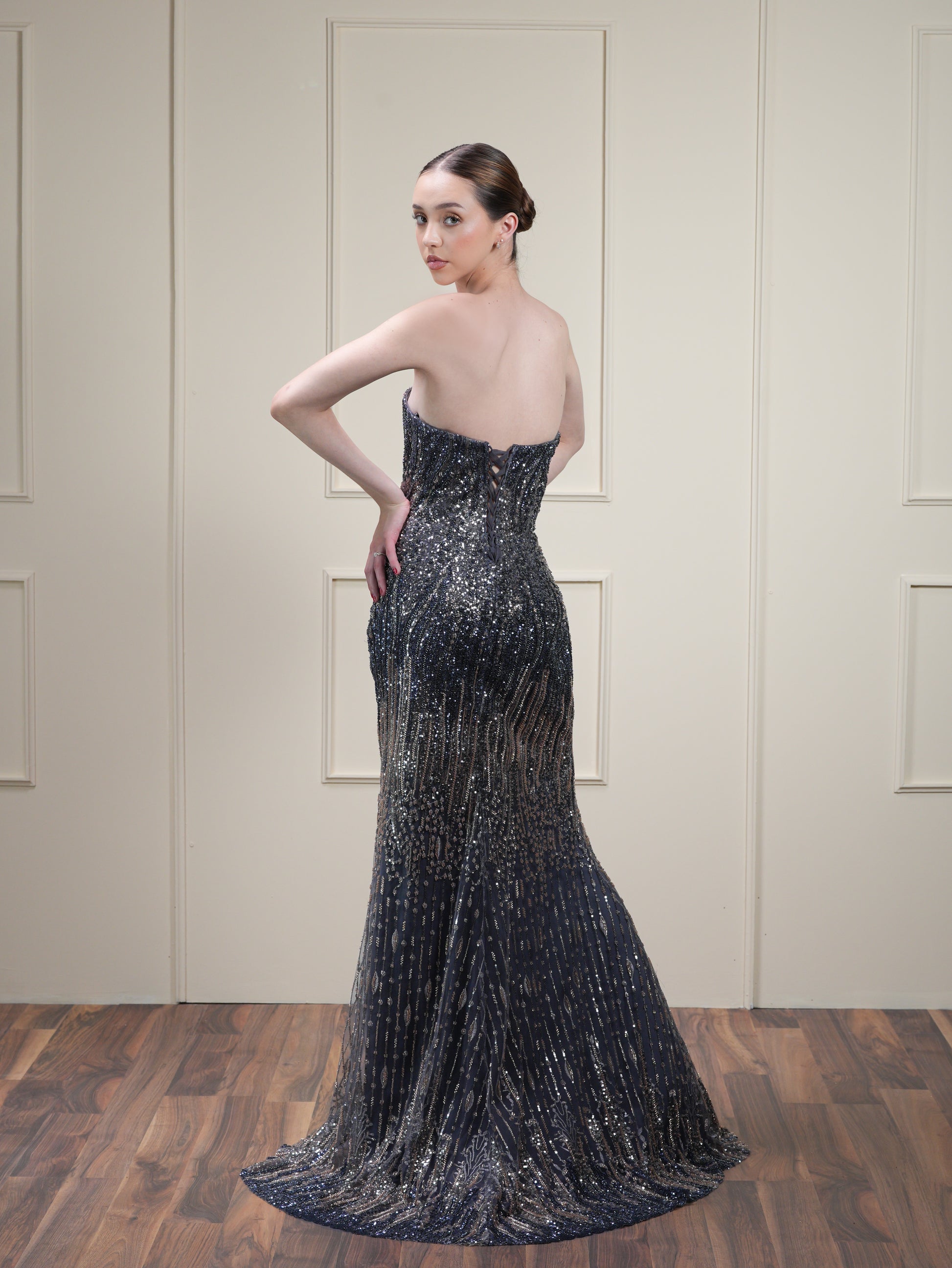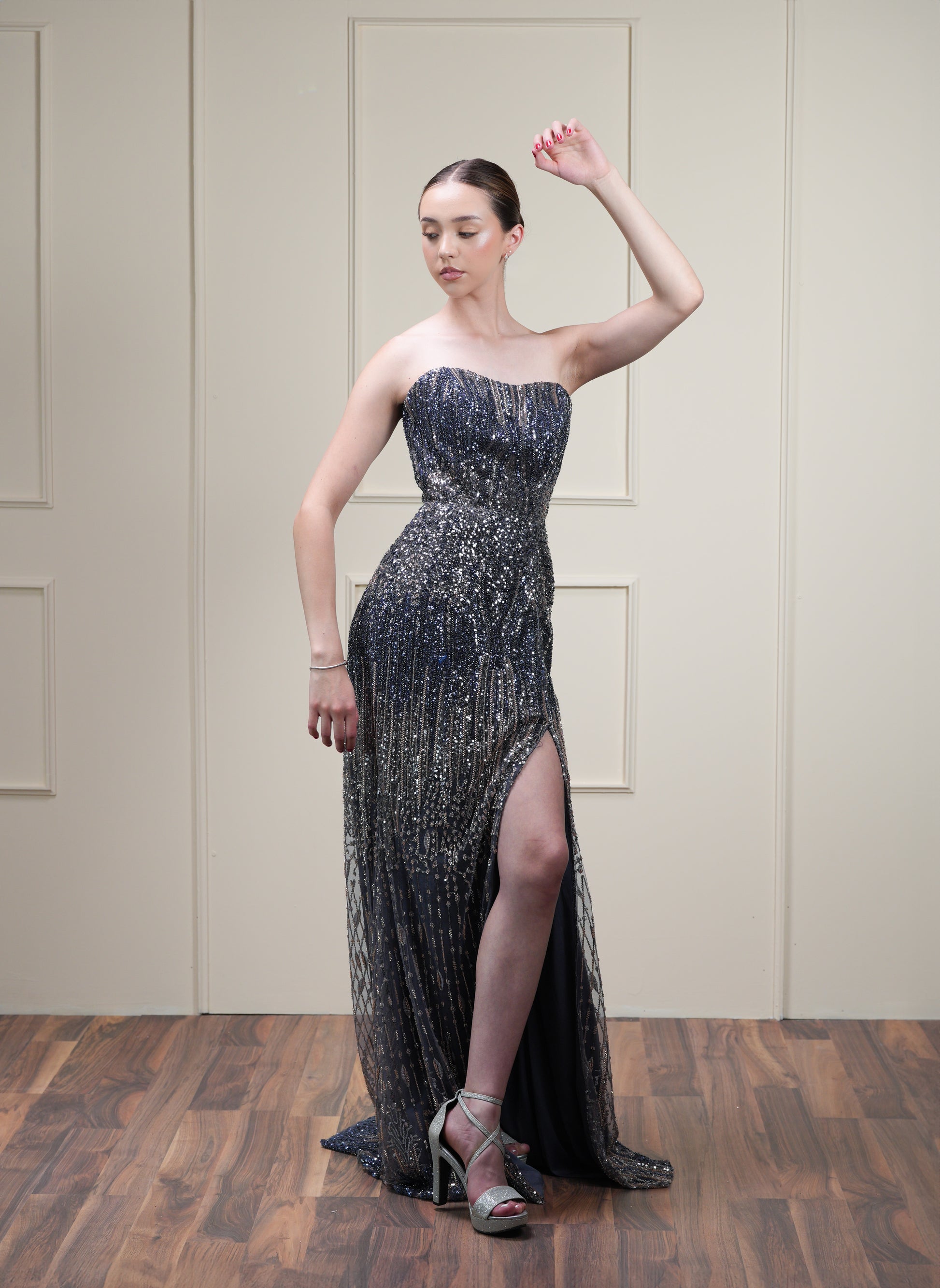 Vestido Straple Lentejuela Azul y Dorada con Abertura en Pierna