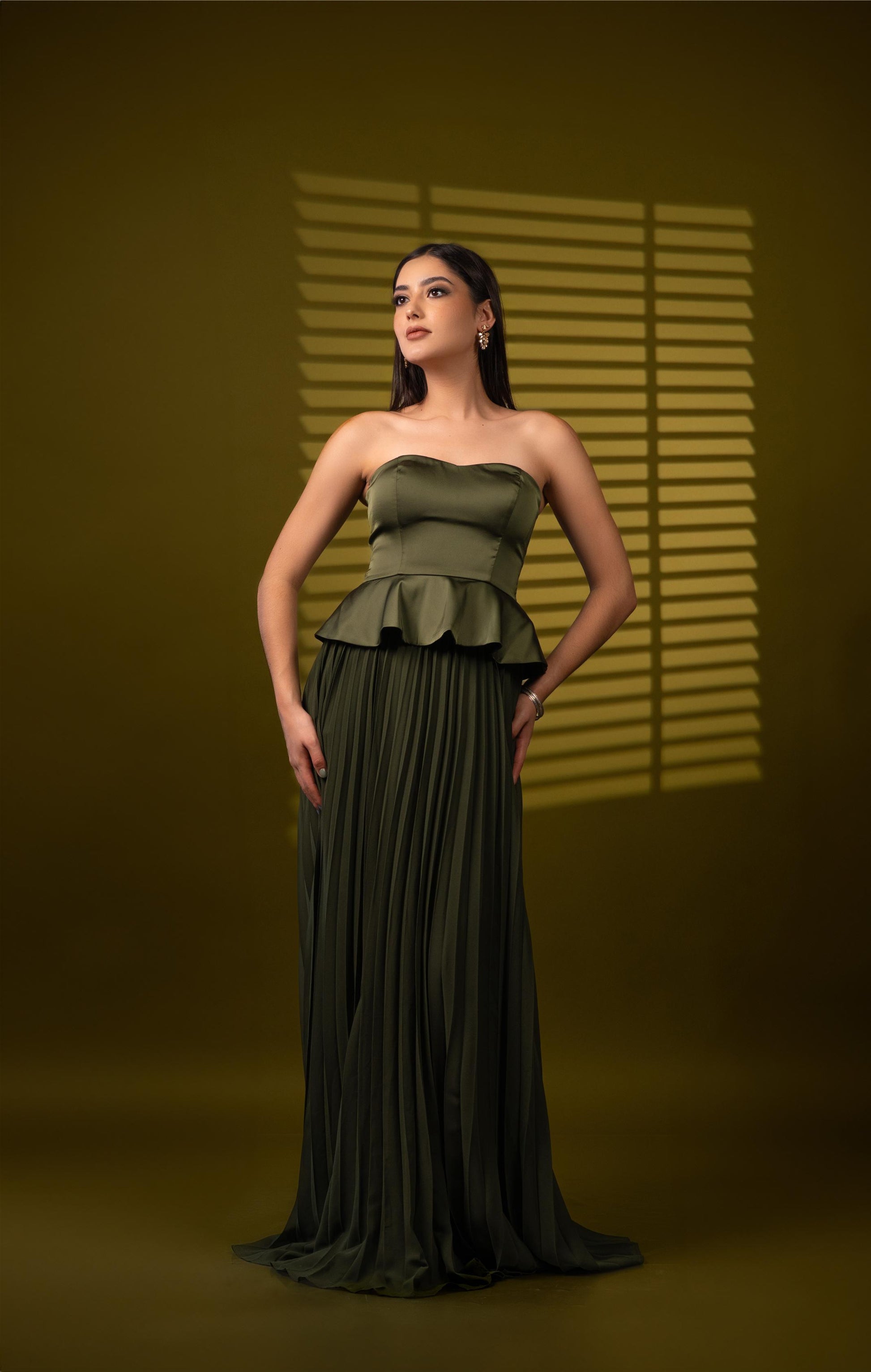 Vestido Verde Olivo Corset Straple Falda De Tablones