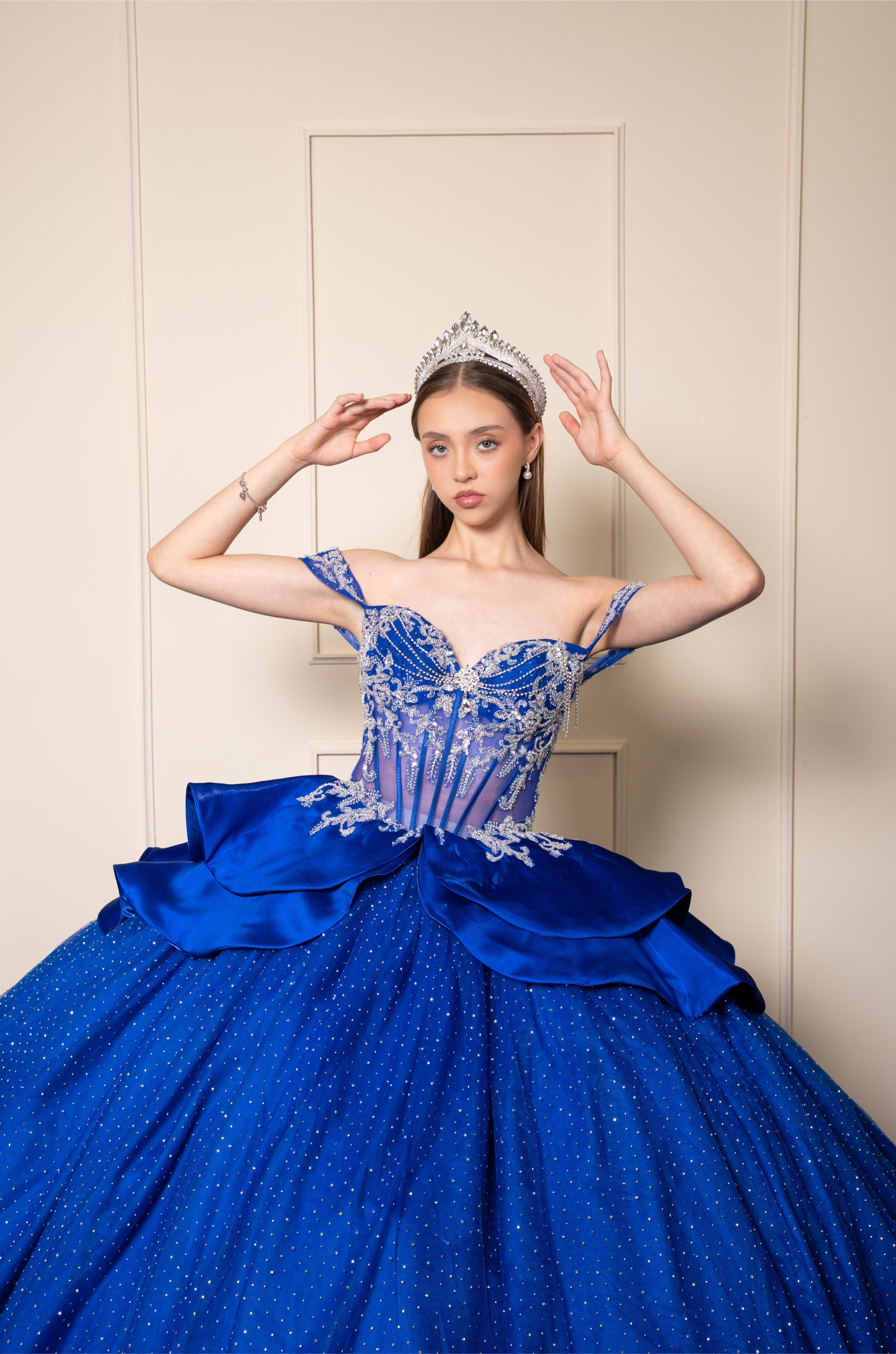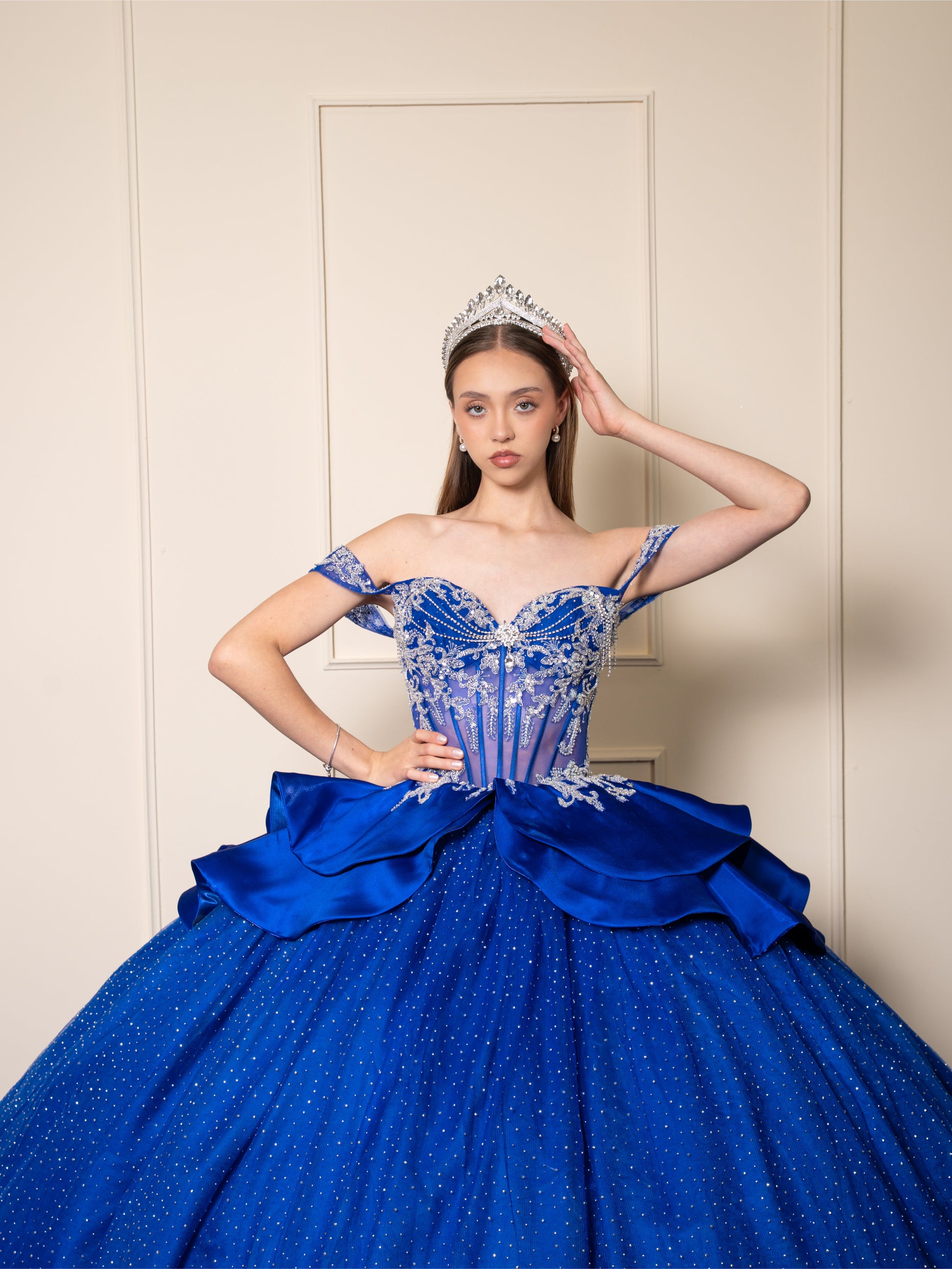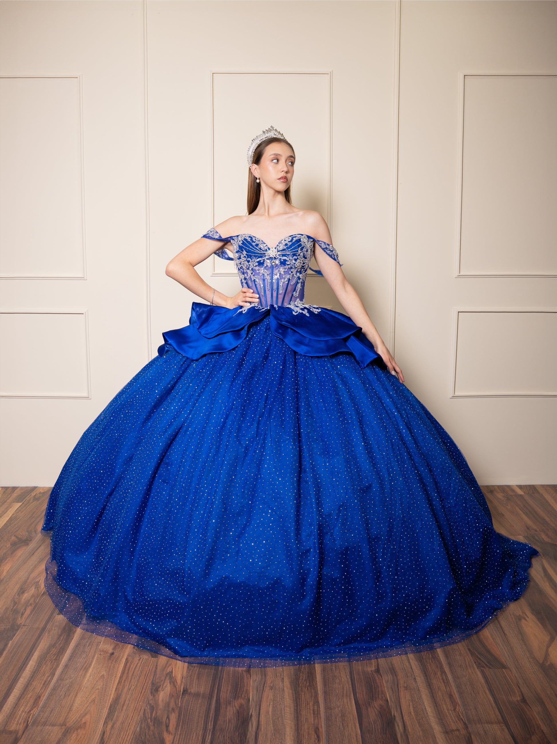 Vestidos de XV Años Azul Rey con Pedrería Plateada Moño de Satin